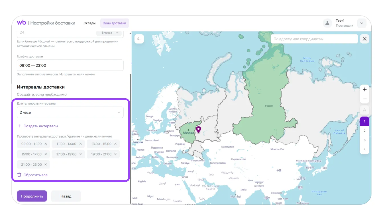 После выбора длительности интервала нажмите «Создать интервалы». Равные интервалы будут созданы автоматически с учётом времени работы вашей доставки. Вы можете удалить лишние или сбросить все.