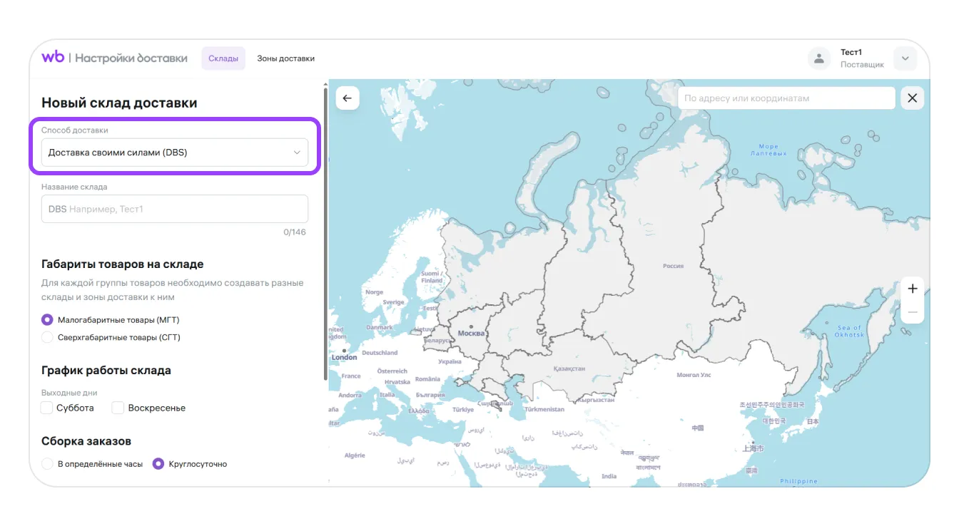 Укажите способ доставки, для которой хотите создать склад — выберите «Доставка своими силами (DBS)».
