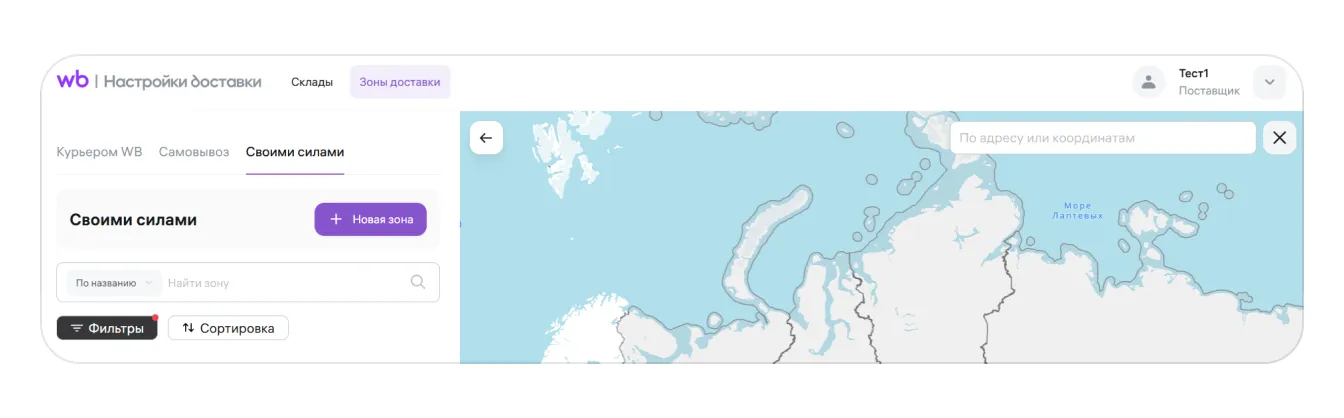 После того, как вы сохранили склад, нажмите Зоны доставки → Своими силами → Новая зона.