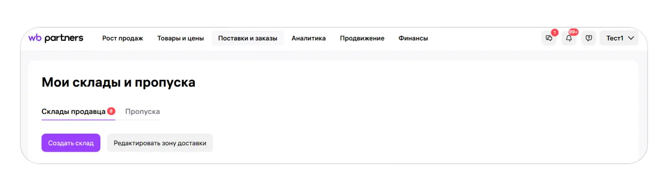 Все склады, которые вы создали, появляются в разделе Маркетплейс → Мои склады и пропуска → Склад продавца.