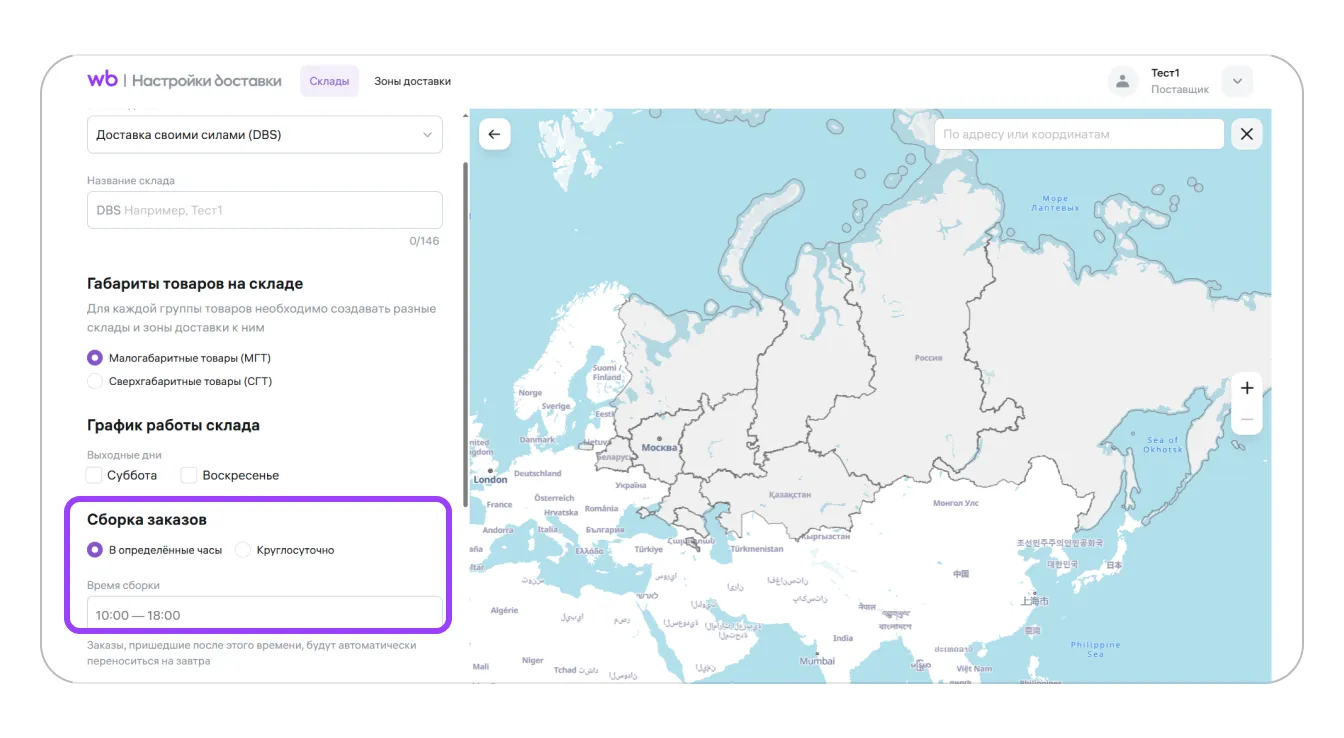 Сборка заказов. Укажите время, когда вы готовы обрабатывать заказы. Если покупатель оформит заказ вне графика сборки, то к сроку доставки прибавится количество часов до начала работы.