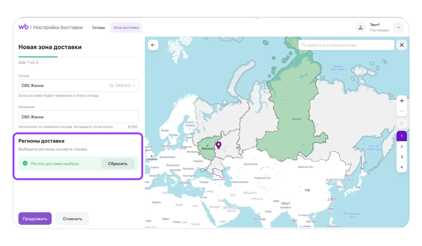 Регионы доставки. Кликните на карте справа на регионы, в которых будете доставлять товары. Если кликнуть повторно на выбранный регион, то выбор будет отменён. Также для отмены можно нажать кнопку «Сбросить».