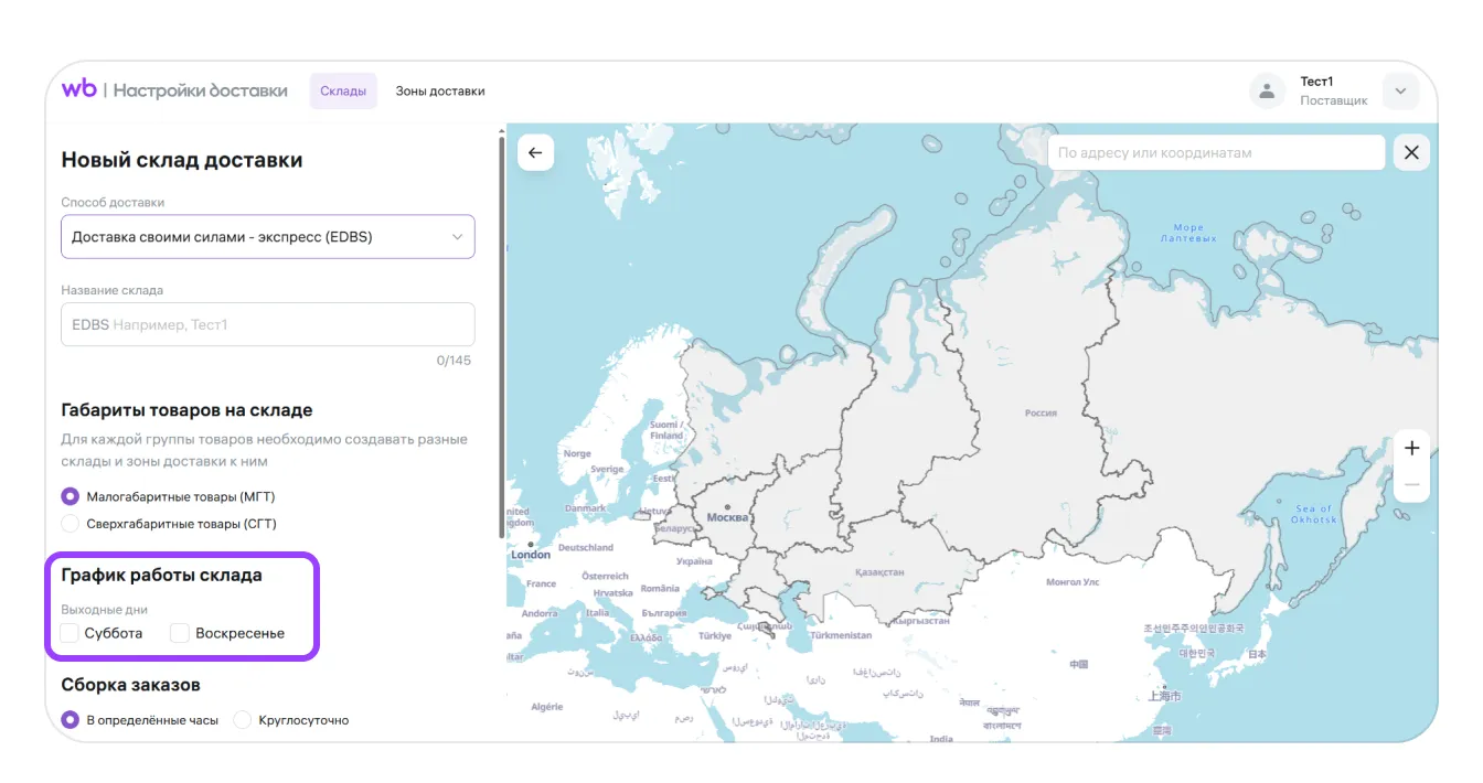 График работы склада. Если у склада есть выходные дни — суббота или воскресенье, отметьте их галочкой. Если у вашего склада нет выходных, то оставьте поля пустыми.