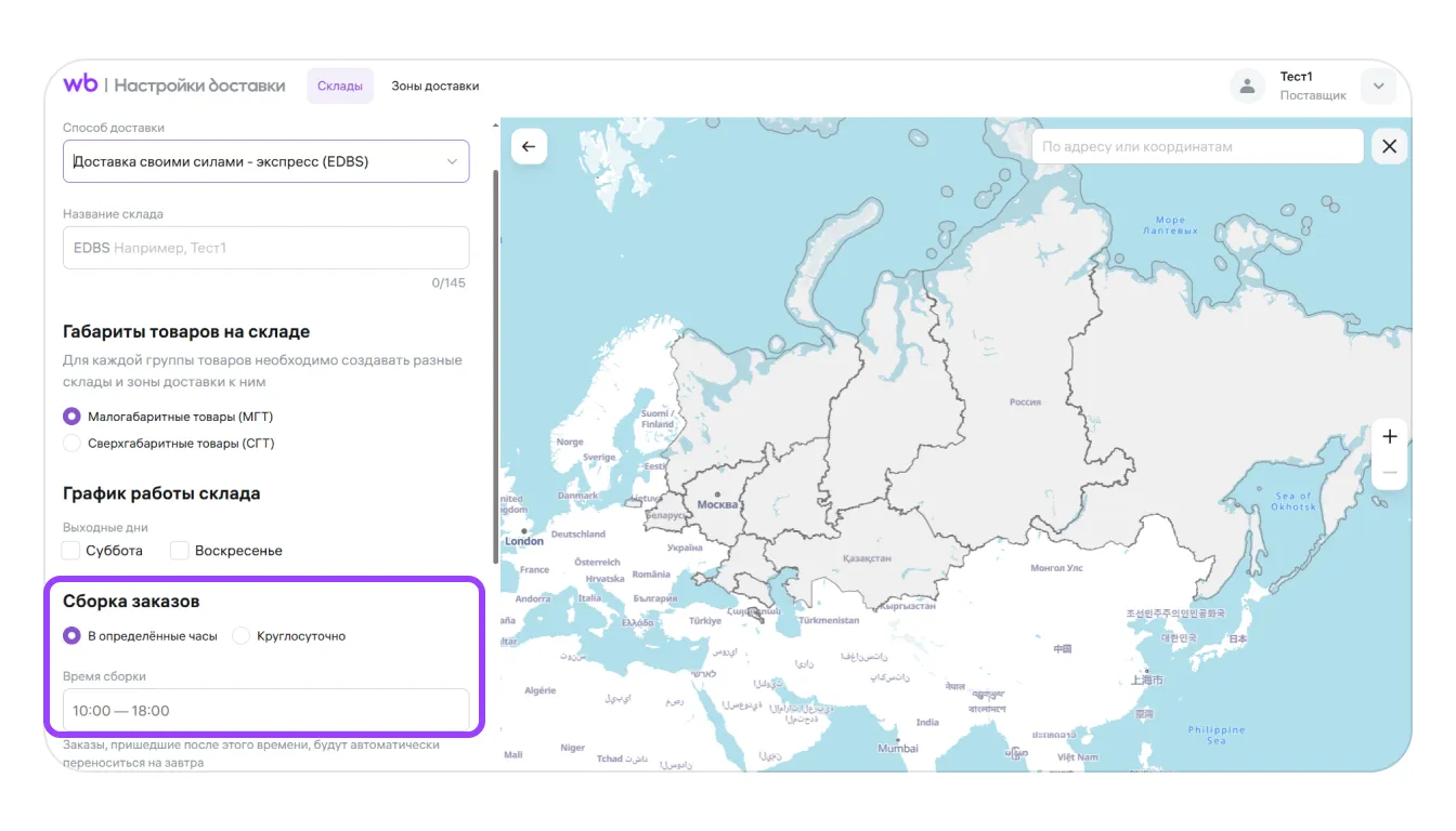 Сборка заказов. Укажите время, когда вы готовы обрабатывать заказы. Если покупатель оформит заказ вне графика сборки, то к сроку доставки прибавится количество часов до начала работы.