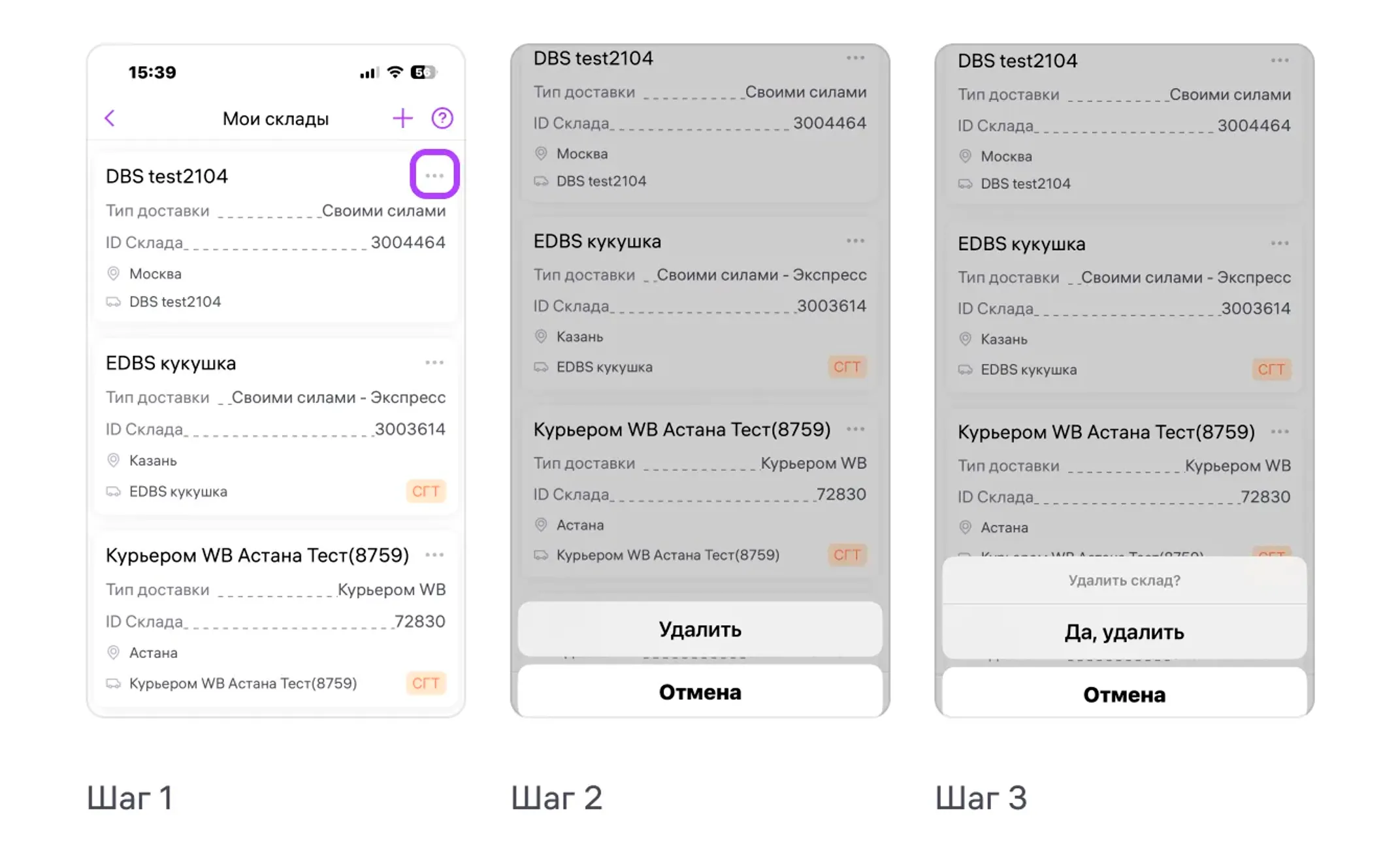 Нажмите три точки справа от нужного склада. Появятся кнопки «Удалить» и «Отмена». Нажав «Удалить», подтвердите своё действие, нажав кнопку ещё раз. Или нажмите «Отмена», если передумали.