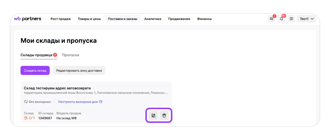 Все склады, которые вы создали, появляются в разделе Маркетплейс → Мои склады и пропуска → Склад продавца.