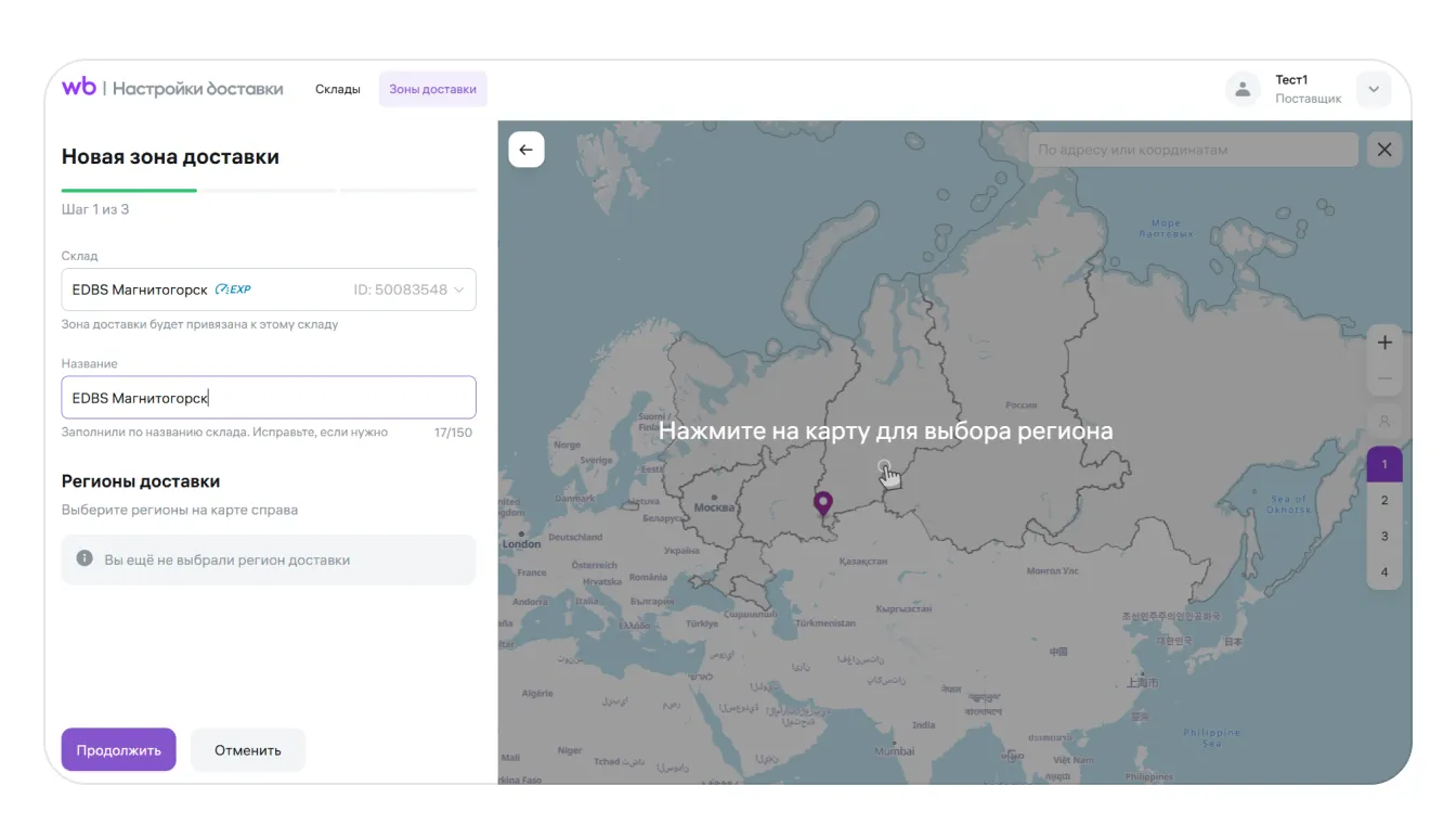 Учтите, что создать склад и зону доставки можно только в той стране, в которой зарегистрировано юридическое лицо продавца