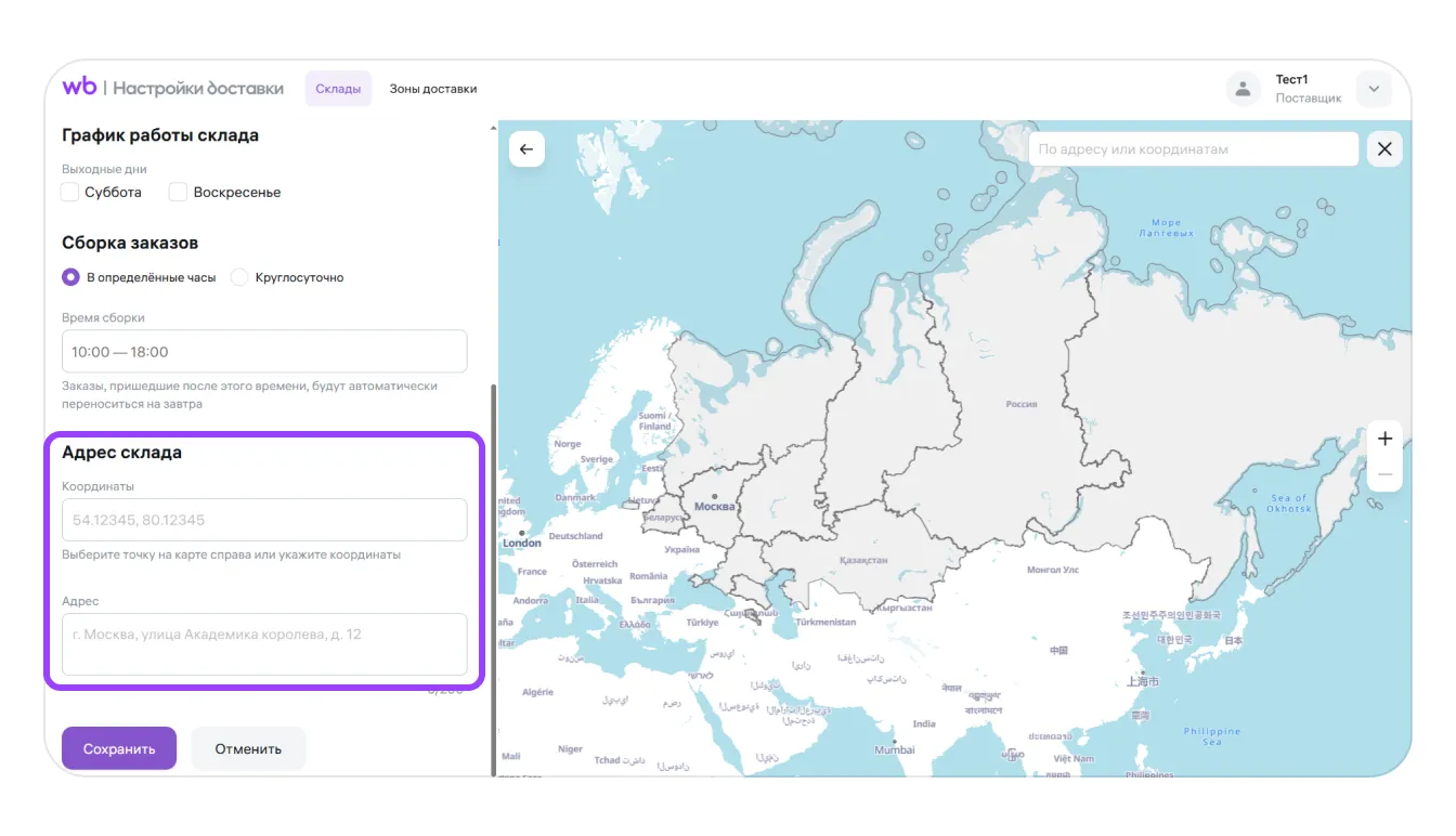 Координаты склада. Укажите склад на карте справа или введите его адрес в поисковую строку над картой. Его координаты отобразятся автоматически. Также координаты адреса можно посмотреть на Яндекс.Картах, скопировать и вставить их в поле.
