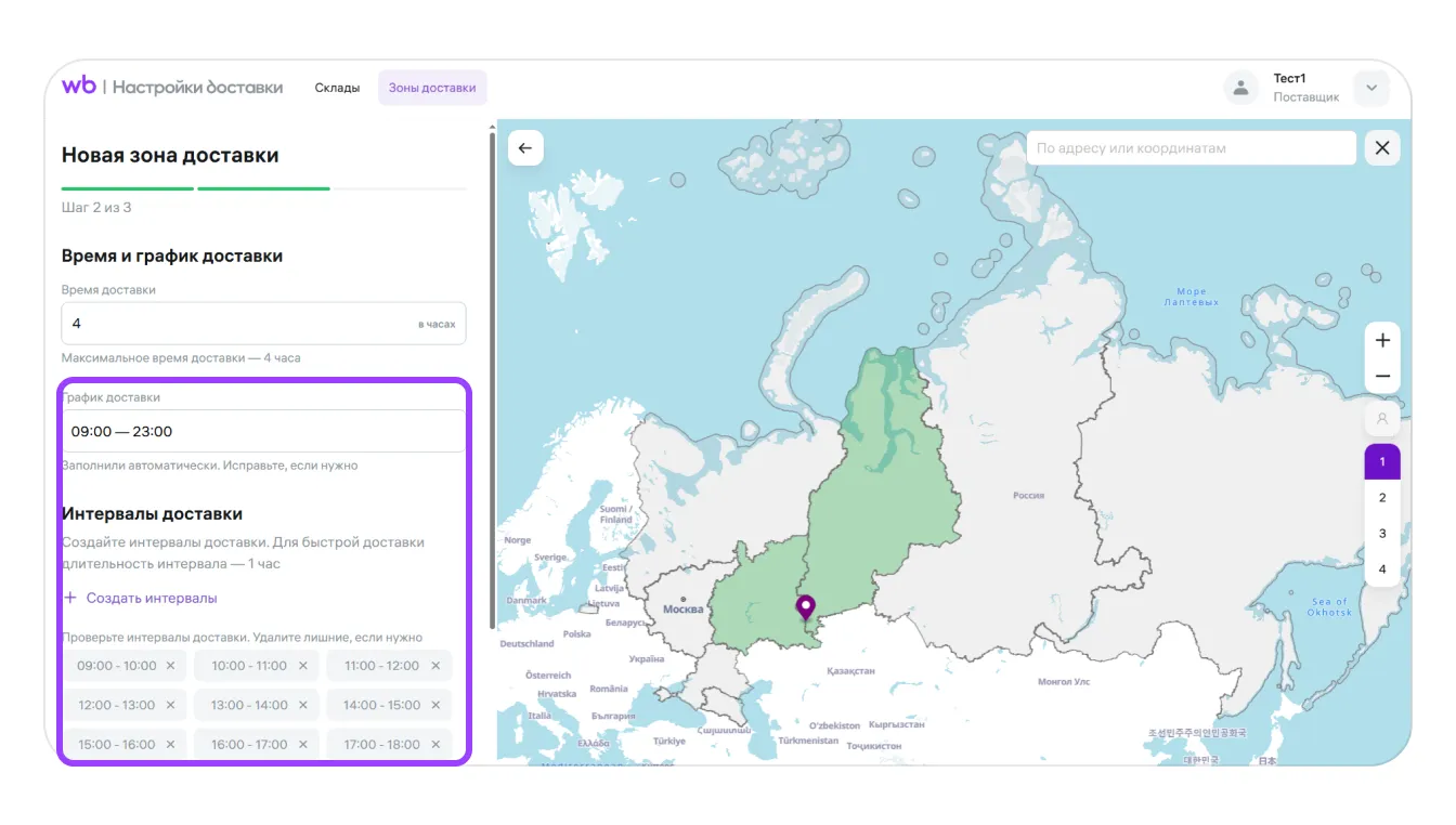 Время доставки. Укажите время, за которое вы готовы доставлять товары с выбранного склада в часах. Оно должно включать время на сборку. Максимальное время доставки — 4 часа.