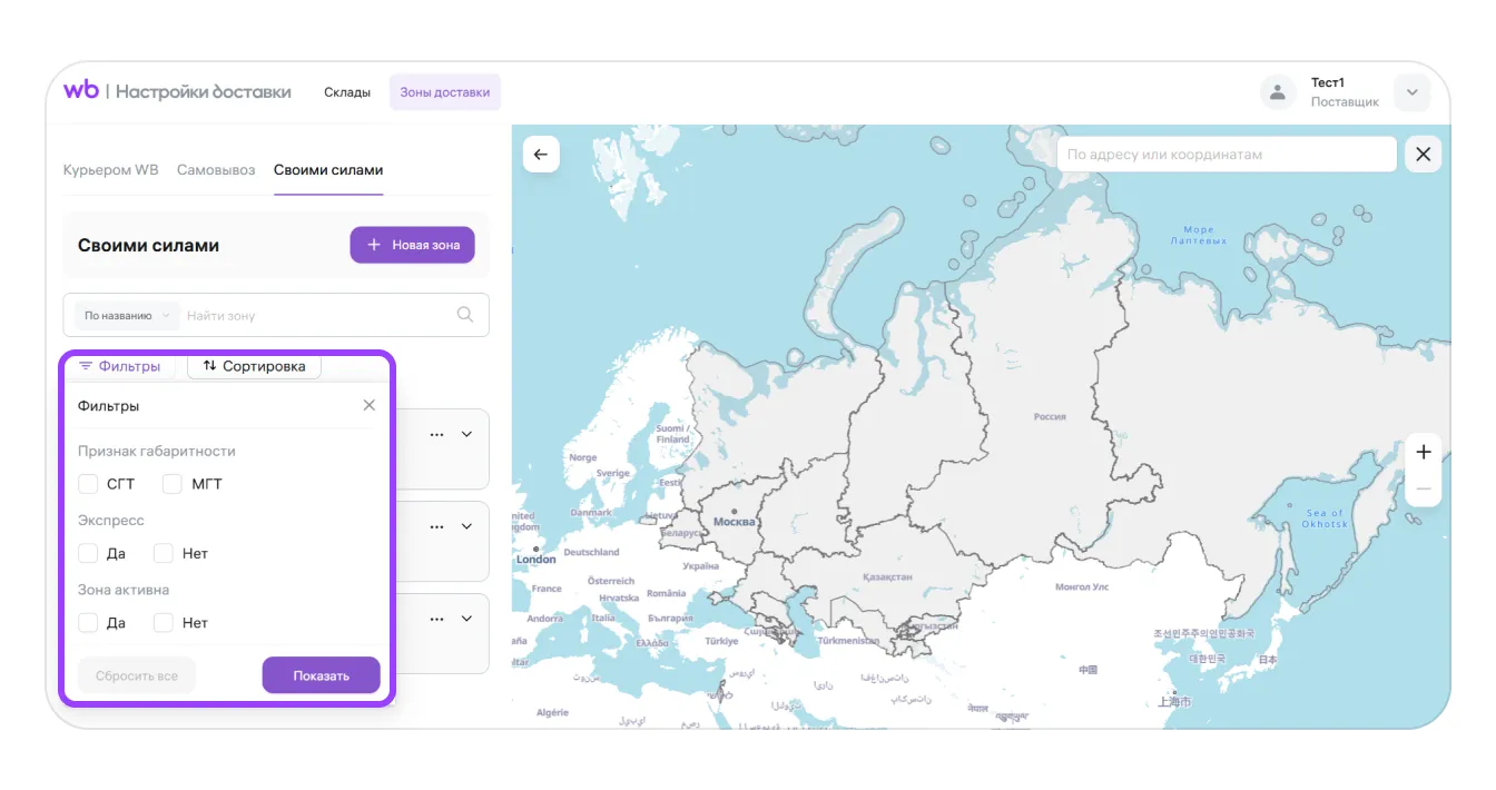 На странице настроек доставки есть кнопка «Фильтры». Нажмите её, если хотите отсортировать склады и зоны по габаритности товаров, скорости доставки и активности. Склады можно также отсортировать по типу доставки.