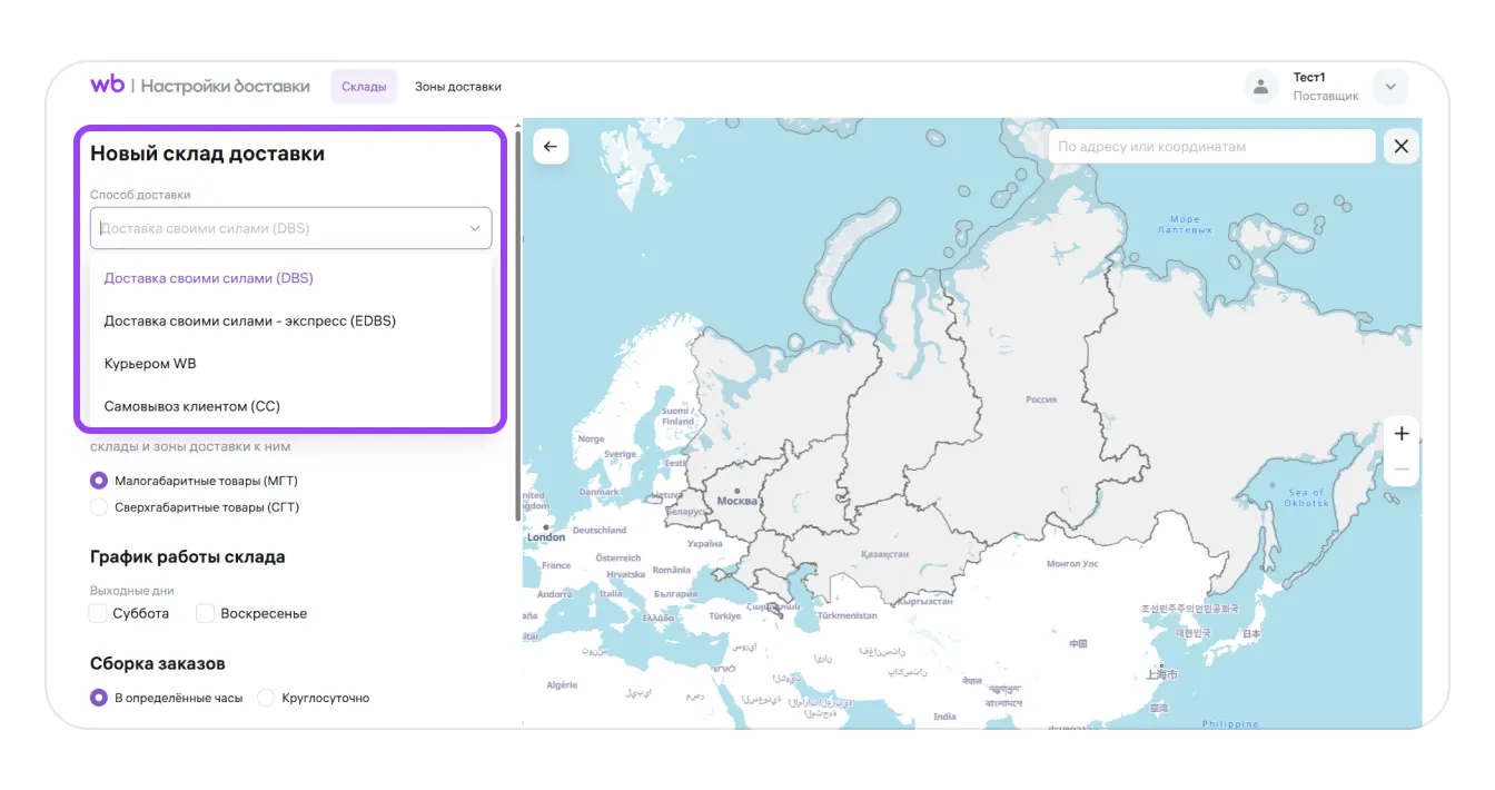 Склад. В выпадающем списке выберите склад, с которого вы будете доставлять заказы.