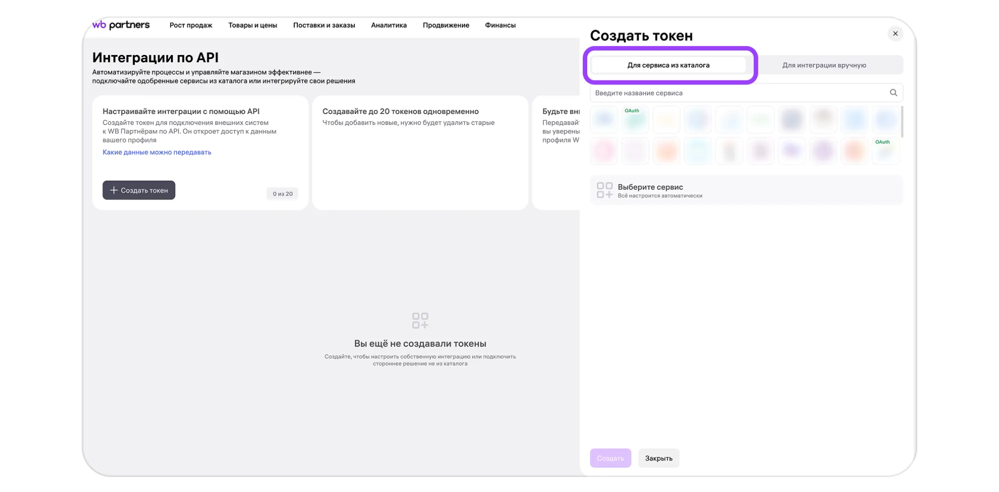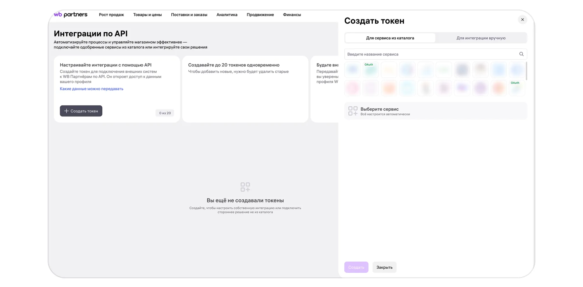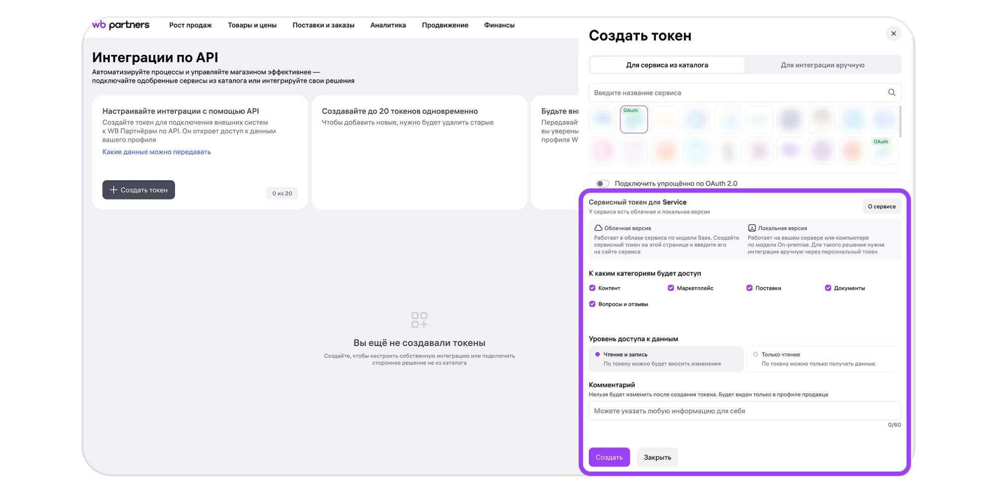 Сервисный токен нужен для подключения выбранного облачного сервиса из Каталога готовых решений для бизнеса на Wildberries. После того как вы открыли окно создания токена: