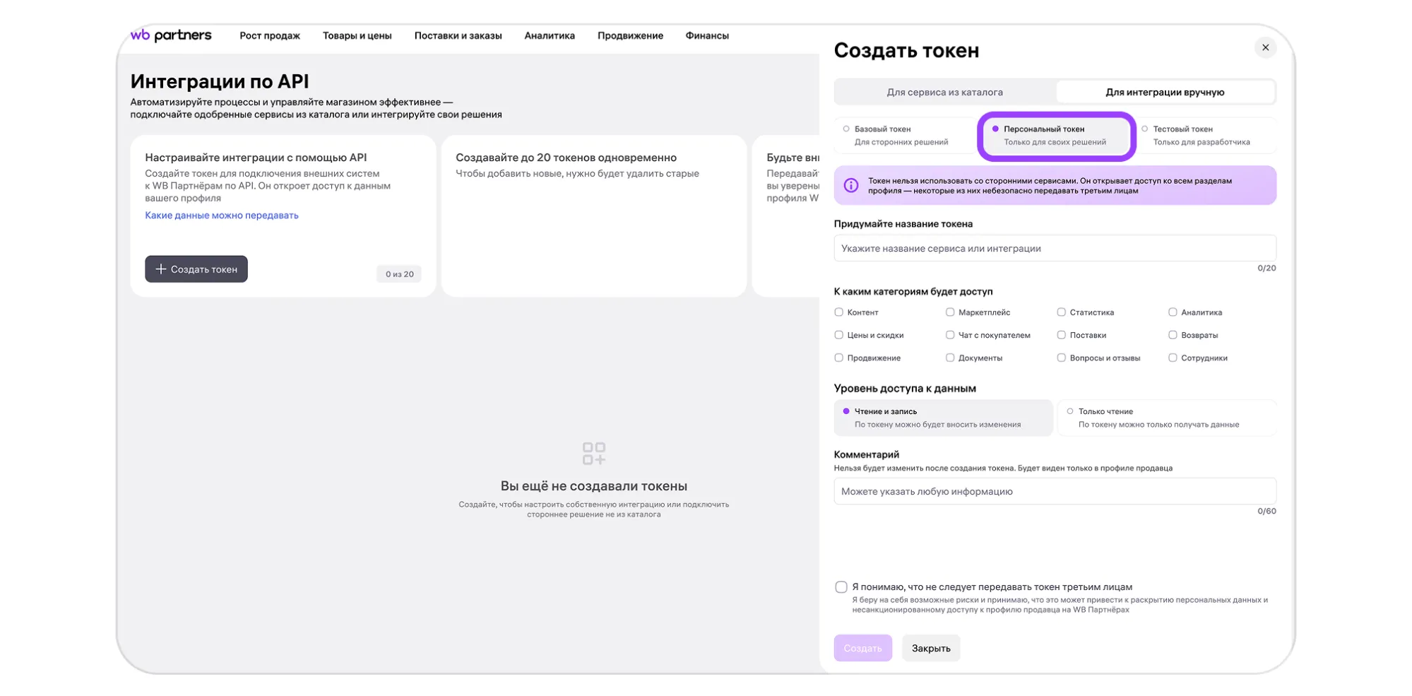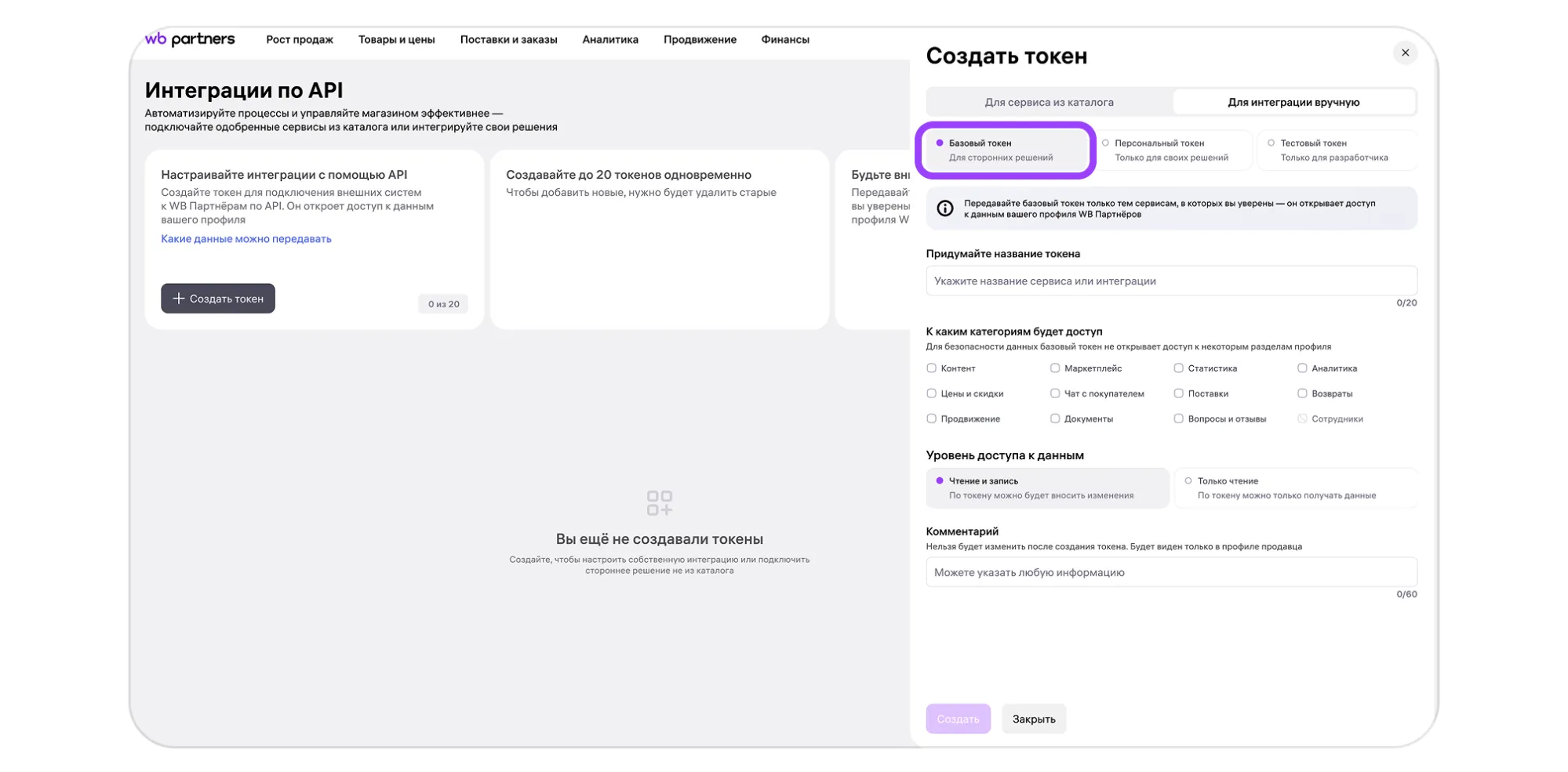 чтение и запись — по токену можно будет получать данные из WB Partners и изменять их на портале,