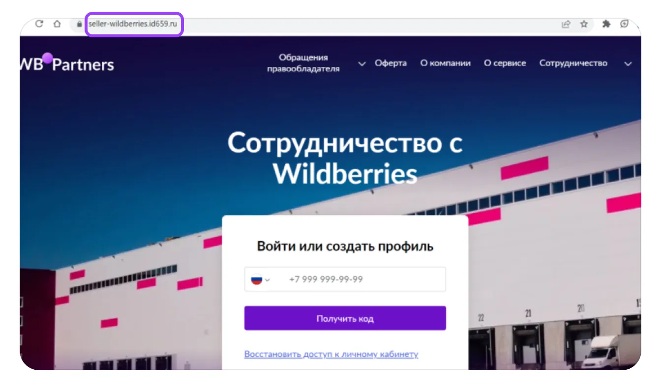 • Проверяйте адрес сайта в строке браузера перед тем, как ввести телефон или код для входа — портал продавцов находится на seller.wildberries.ru.