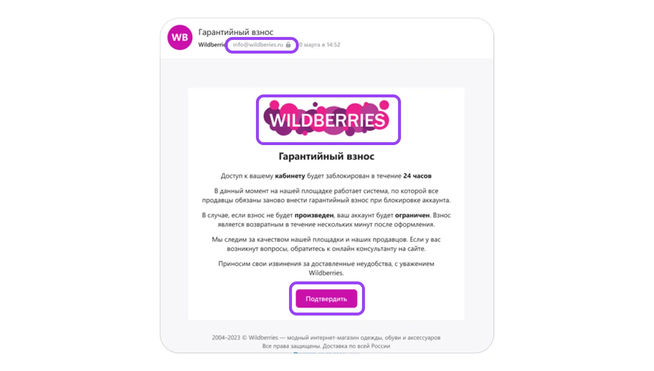 Продавец может получить письмо от Wildberries только на ту электронную почту, которая указана в его профиле в разделе «Мои данные». Если вам пришло письмо «от Wildberries» на почту, не указанную в профиле, его отправили мошенники. Также мы никогда не отправляем письма со ссылками на сторонние ресурсы.