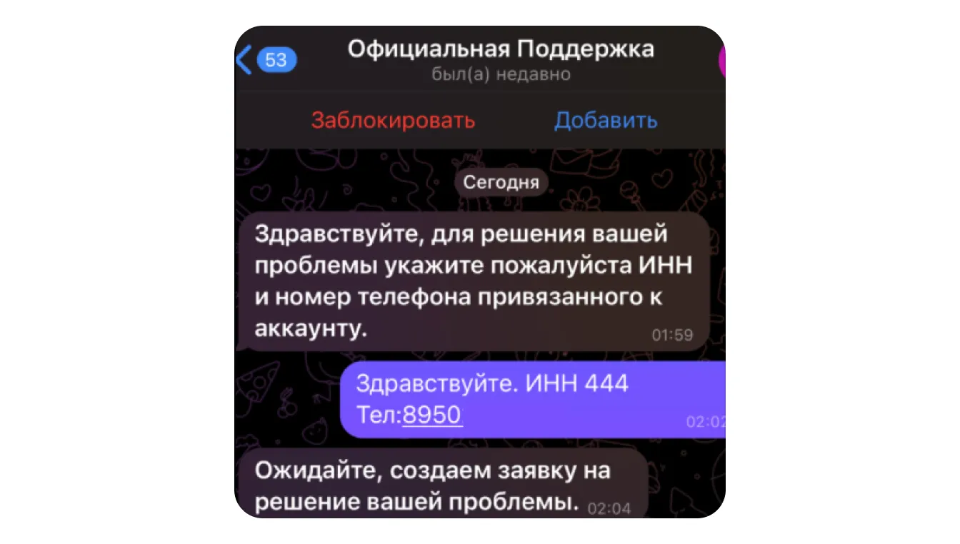 Признаки обмана: cообщение в мессенджере, просьба указать данные.