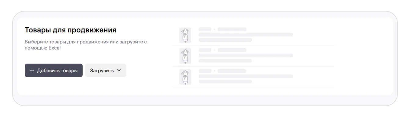 Если товаров много, вы можете загрузить список артикулов для продвижения через шаблон в формате CSV или XLXS.