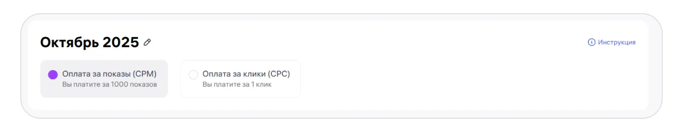 Для кампании с оплатой за показы выберите ручную или единую ставку. Для ручной ставки определите зоны показов.