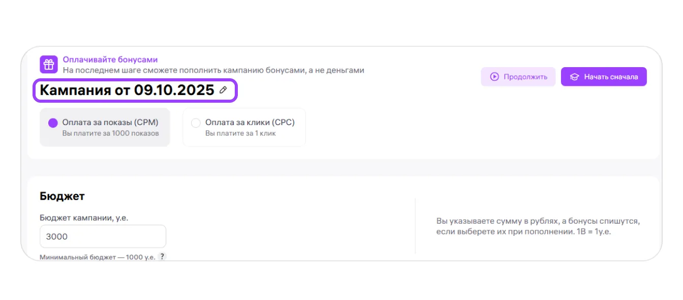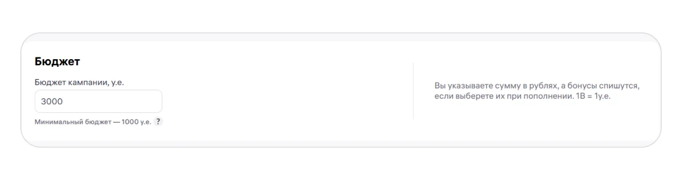 3. Укажите бюджет кампании — сумму, которую вы готовы потратить на продвижение.