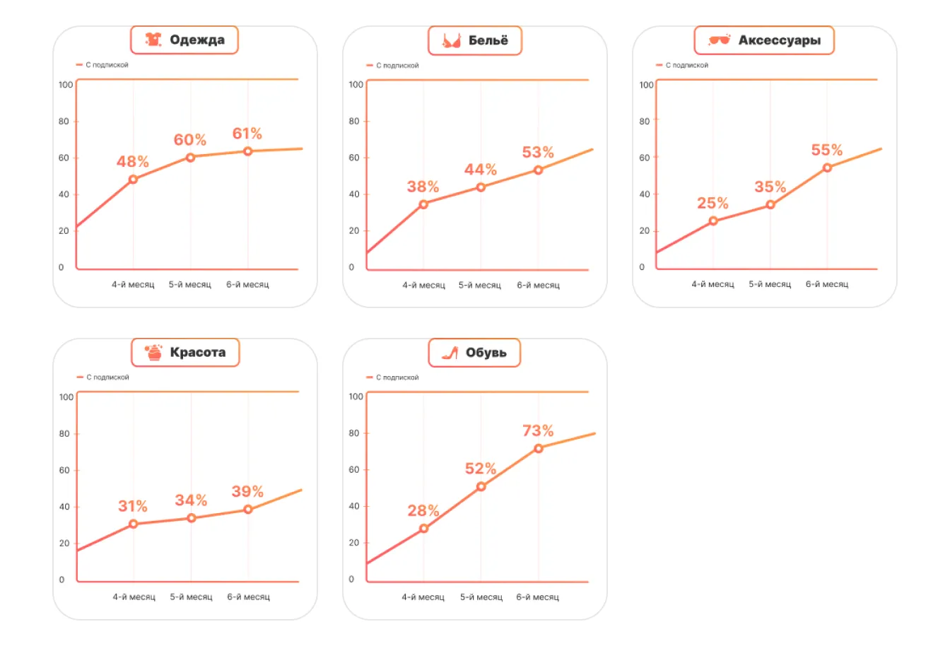 Есть и накопительный эффект: показатель выручки у таких продавцов растёт каждый месяц. На 3-й месяц использования подписки он выше на 35%, на 4-й — на 42%, на 5-й — на 48%, и на 6-й месяц достигает разницы в 53%.