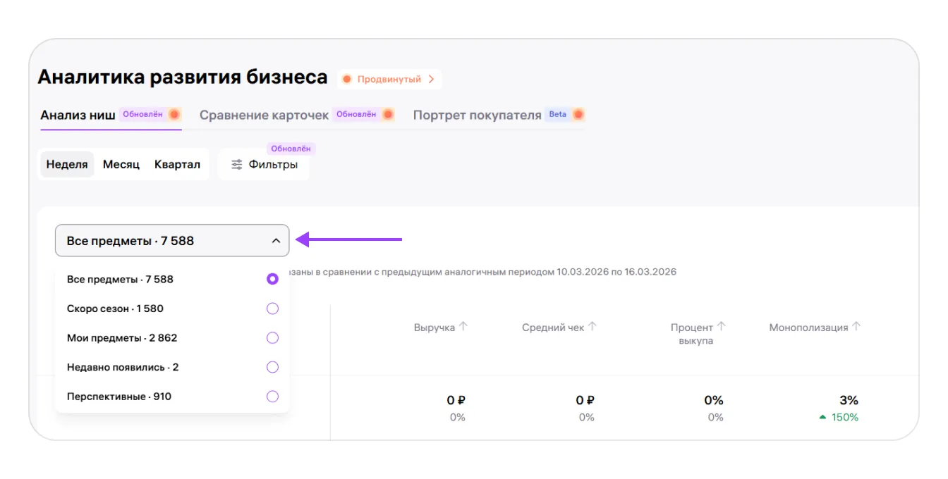 Учитываются только предметы с продажами за последние 30 дней и остатками на складах (кроме фильтра «Недавно появились» — для него продажи необязательны). Предметы, по которым нет данных о сезонности спроса, в фильтр не попадают.
