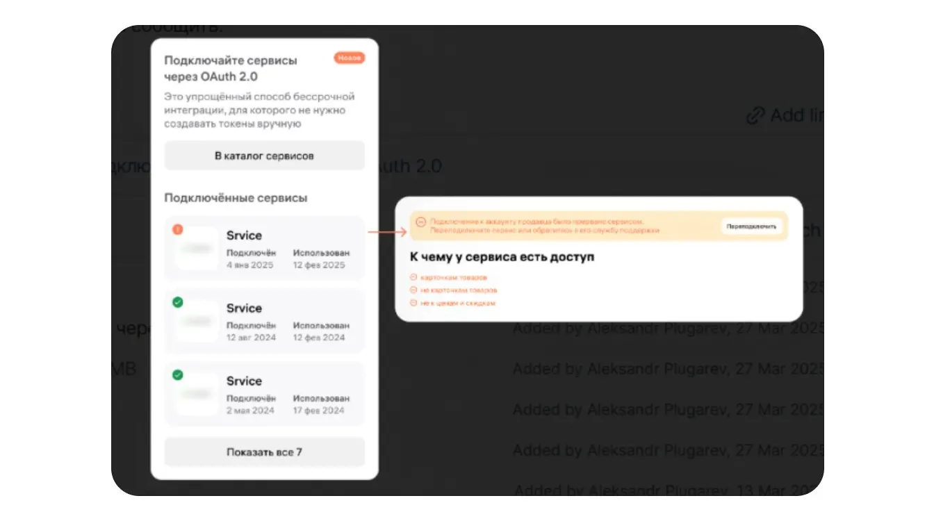 • Централизованное управление: сервисы, подключённые через OAuth 2.0, можно просматривать и отключать в разделе Интеграции по API в личном кабинете.