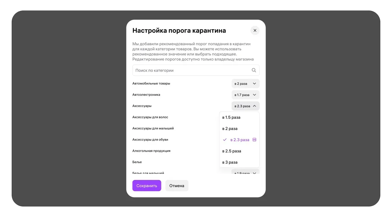 Исключение для этой функции — товары с поразмерным редактированием цен. Если цена на такой товар резко уменьшится, она не попадёт в карантин.