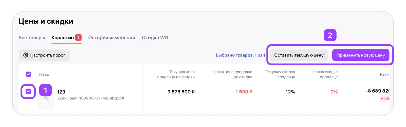 Если в новой цене нет ошибки, вы можете подтвердить её на вкладке «Карантин». Также на этой вкладке можно отменить это изменение.