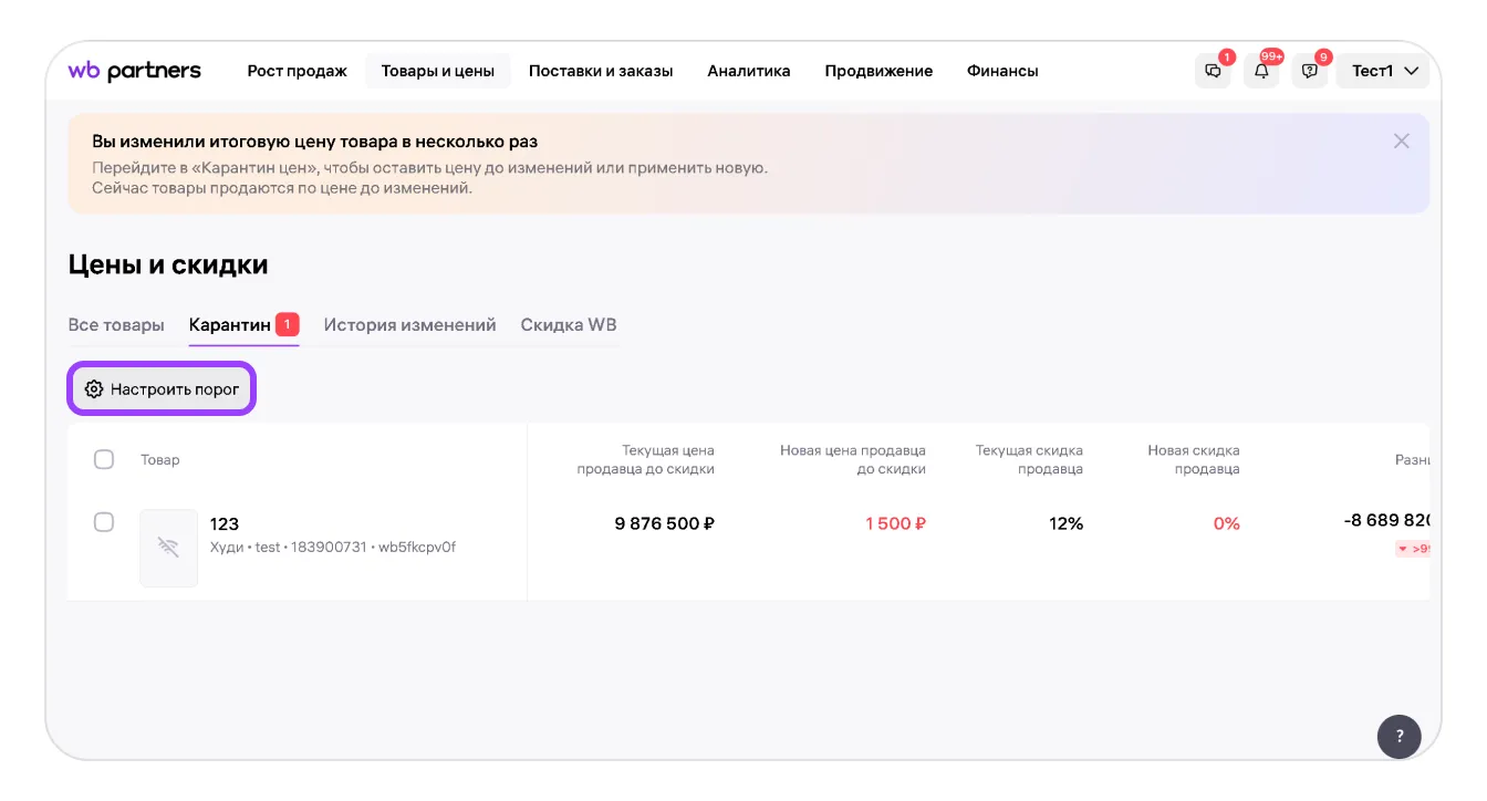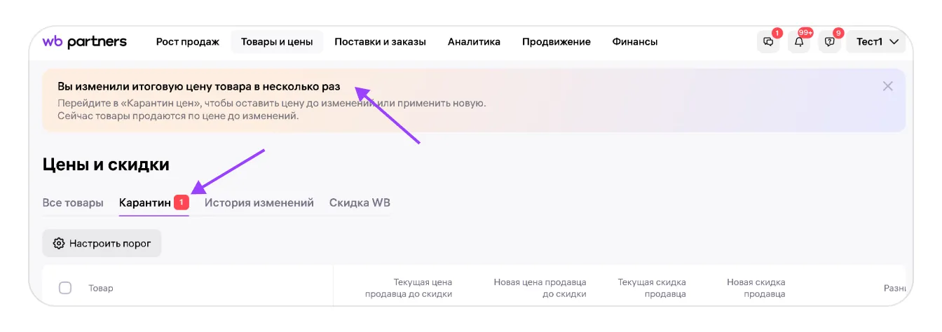 На странице «Цены и скидки» вы увидите баннер с предупреждением, а сам товар появится на вкладке «Карантин»