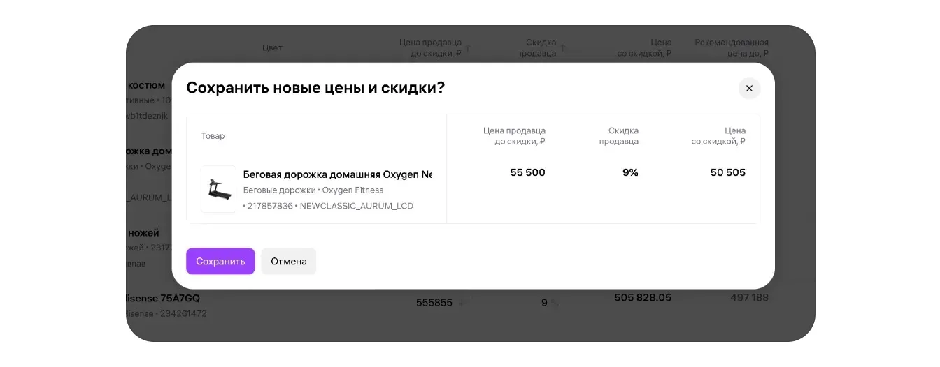 В таблице появится возможность редактировать столбцы «Цена продавца до скидки» и «Скидка продавца». Данные в столбце «Цена со скидкой» будут пересчитываться автоматически.