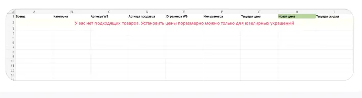 Установить разные цены на разные размеры товара можно только для категории «Ювелирные украшения». Для этого выберите Действия с Excel → Обновить цены поразмерно. Далее проделайте те же шаги, что описаны выше — разница будет только в наличии столбцов «ID размера WB» и «Имя размера» в шаблоне.