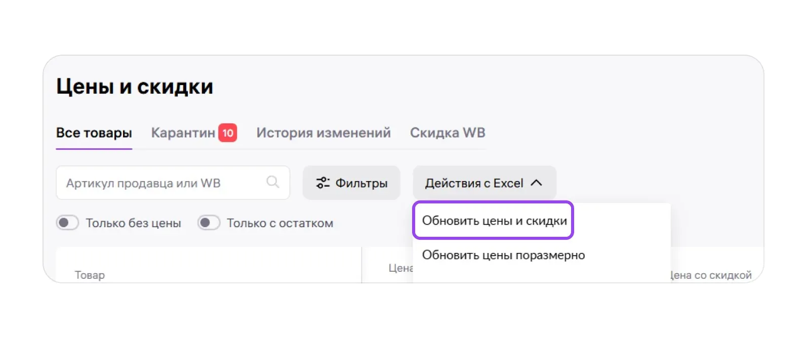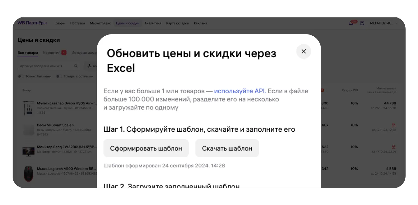 Этим способом можно обновить цены, только если у вас не больше 1 000 000 товаров (разных артикулов). Если товаров больше, обновляйте цены с помощью API. Для этого используйте методы из раздела «Цены и скидки».