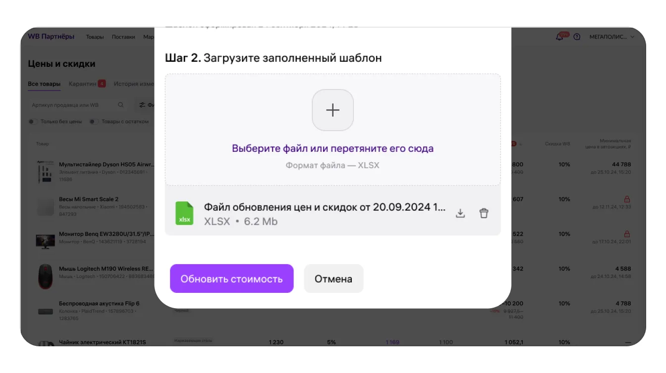 5. Загрузите заполненный шаблон и нажмите «Обновить стоимость»: