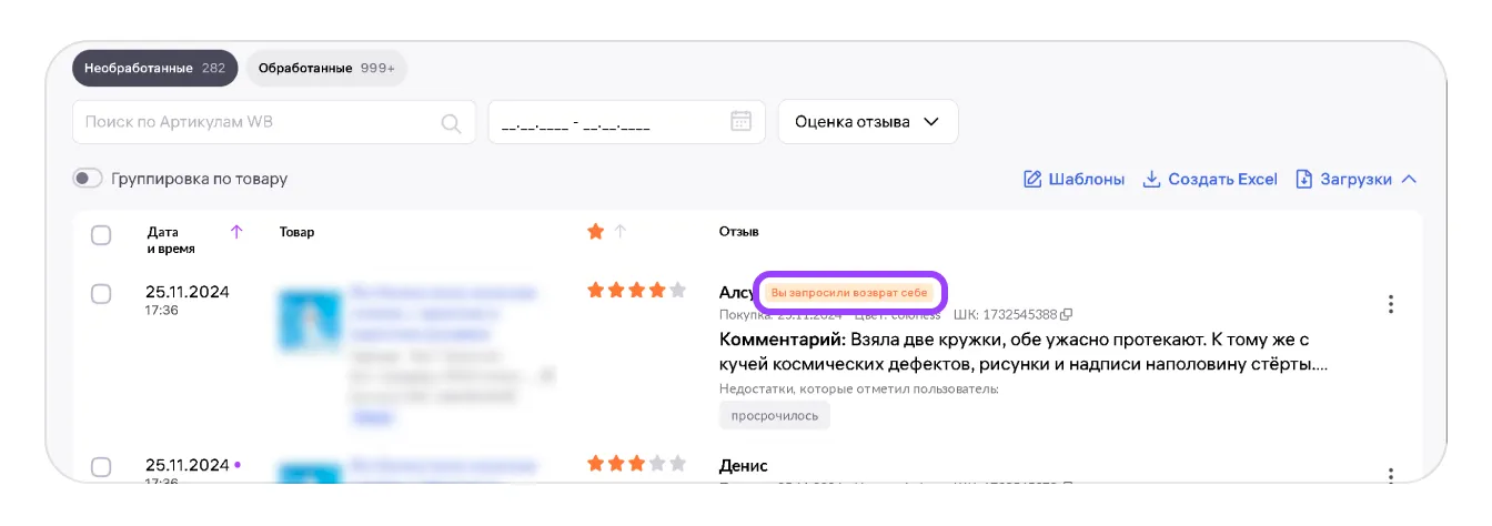 Такой вид возврата может быть оформлен только по вашей инициативе через раздел «Отзывы». Это пригодится, например, если из отзыва покупателя вы понимаете, что товар нужно снять с продажи.