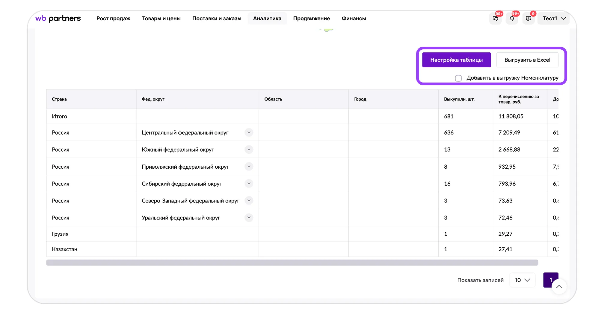 Во вкладке «Области и города» можно посмотреть в каких регионах, в каком количестве реализуются товары. Данные также представлены в двух форматах: в виде карты и таблицы. Чтобы увидеть таблицу, прокрутите страницу ниже.