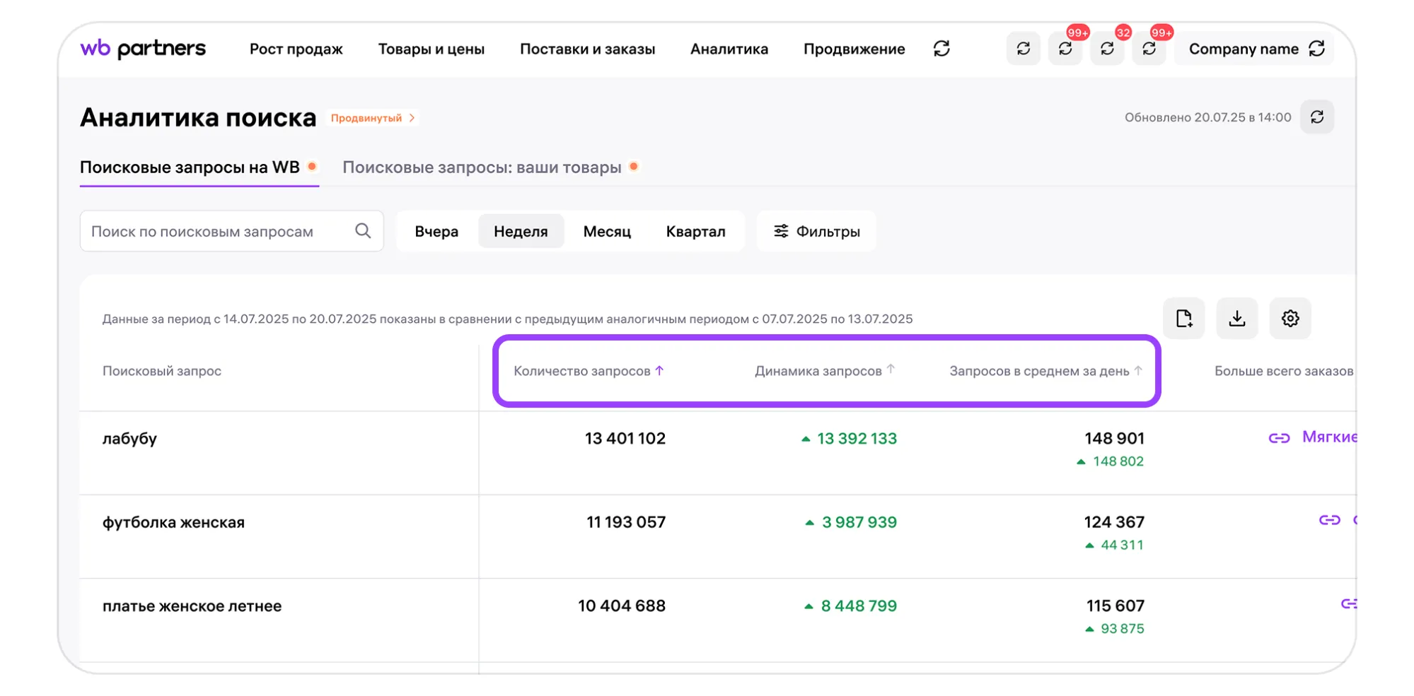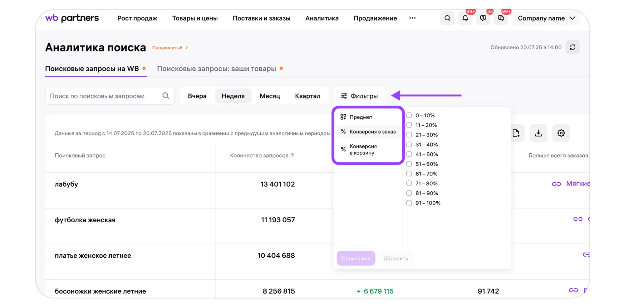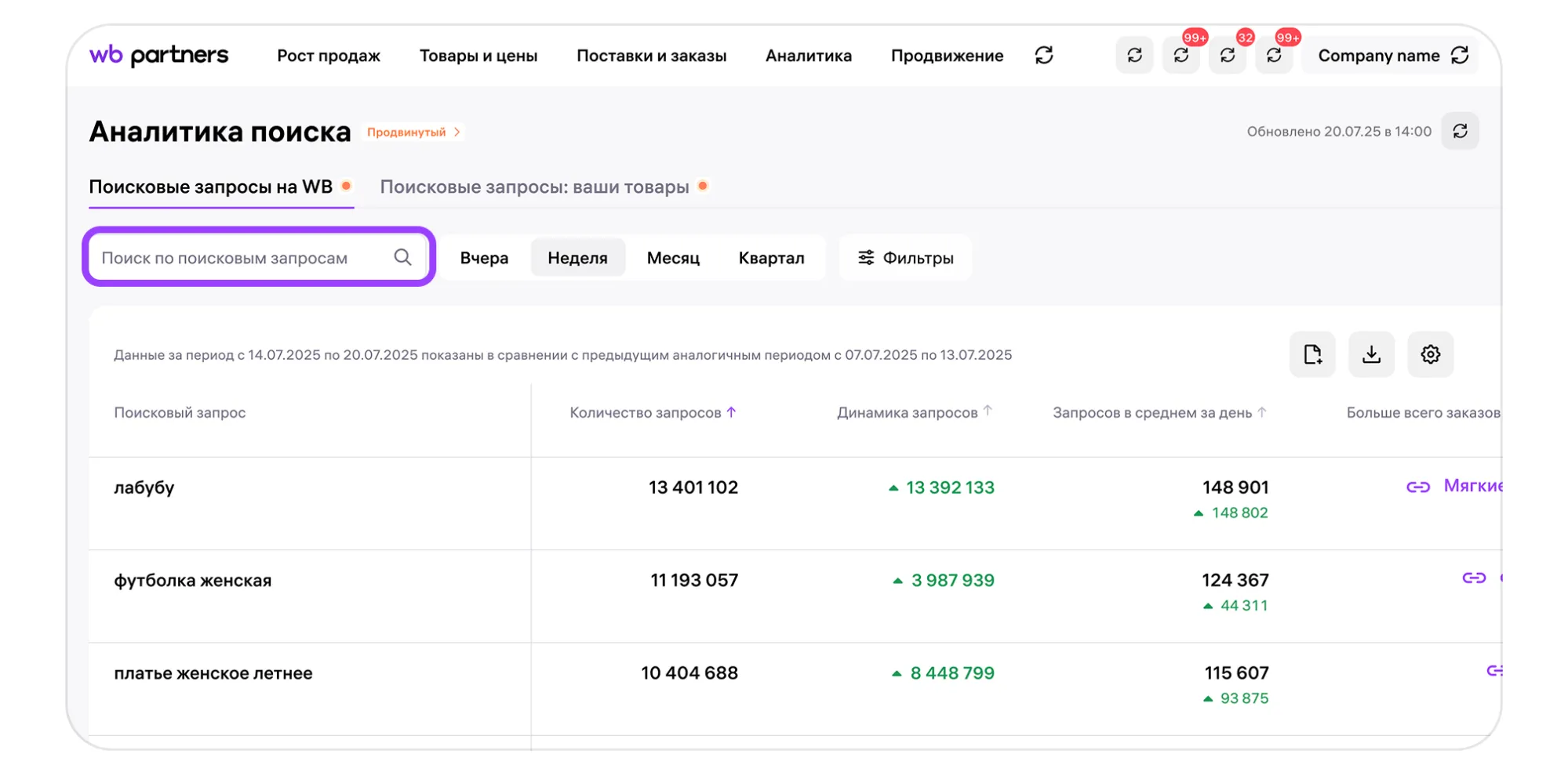 Перейдите в раздел «Аналитика» → Аналитика поиска  → Поисковые запросы на WB. Вы увидите таблицу со списком самых популярных поисковых запросов за выбранный временной период.