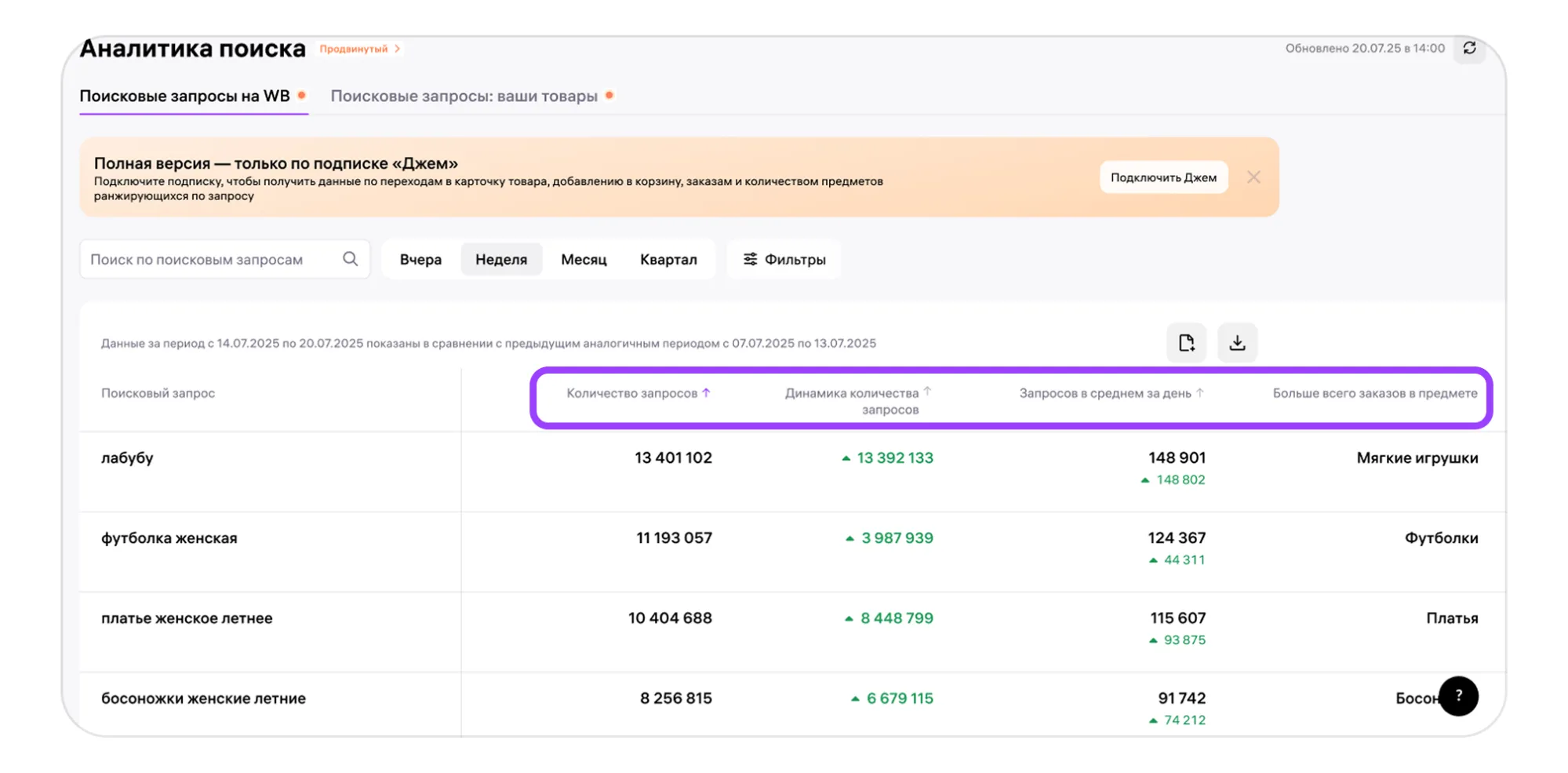 С подпиской «Джем» в отчёте можно не только узнать, что ищут покупатели, но и понять, какие запросы приносят заказы и где спрос выше предложения. Это позволяет: