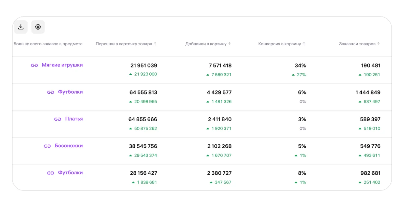 Кроме того, столбец «Больше всего заказов в предмете» становится кликабельным — можно сразу перейти в отчёт «Анализ ниш» и глубже изучить предмет.