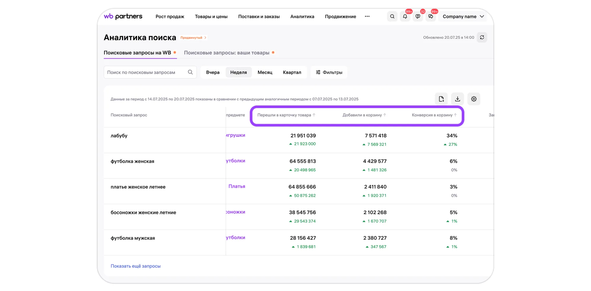 Вы увидите, сколько раз по запросу переходили в карточки товаров, как часто покупатели добавляли товары в корзину, какой процент таких добавлений превращался в заказы, а также сколько всего заказов оформили по конкретному запросу. Показатели «Конверсия в корзину» и «Конверсия в заказ» помогут оценить, насколько хорошо запрос работает на продажи.