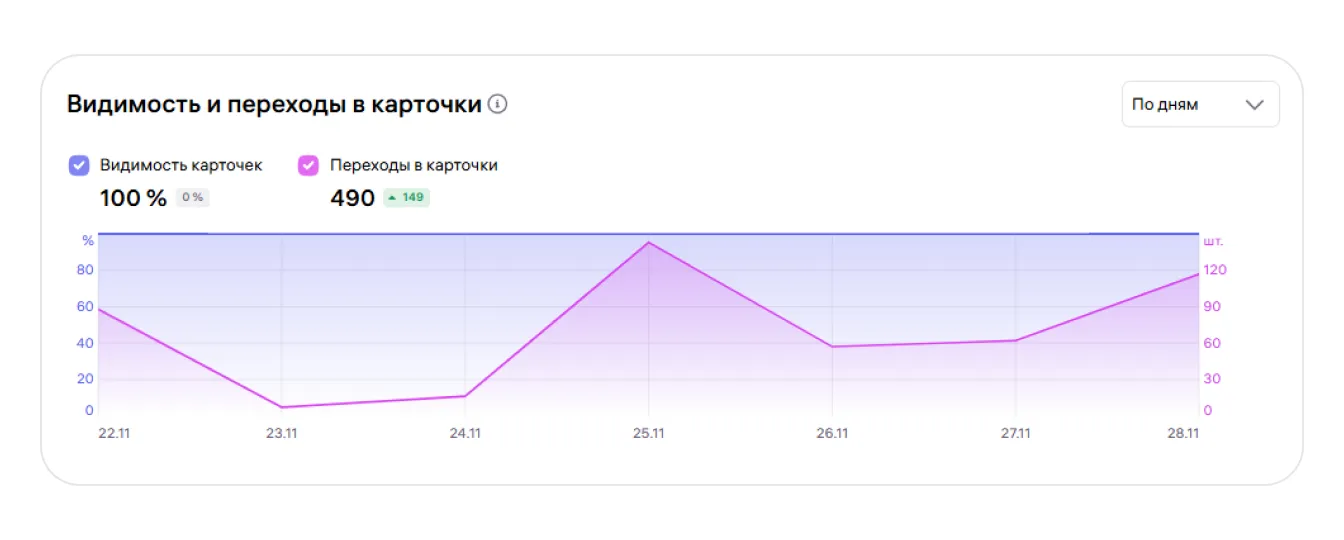 График показывает соотношение видимости карточек товаров для покупателей и их переходов в карточки. Данные можно посмотреть по дням, неделям и месяцам.