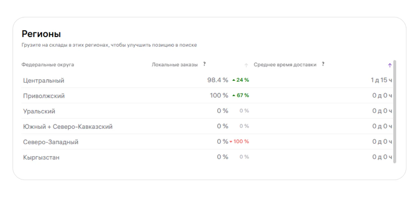 Локальными называются заказы, которые доставляются в пределах одного федерального округа, то есть когда склад и пункт выдачи недалеко друг от друга. Если таких заказов мало, среднее время доставки высокое.