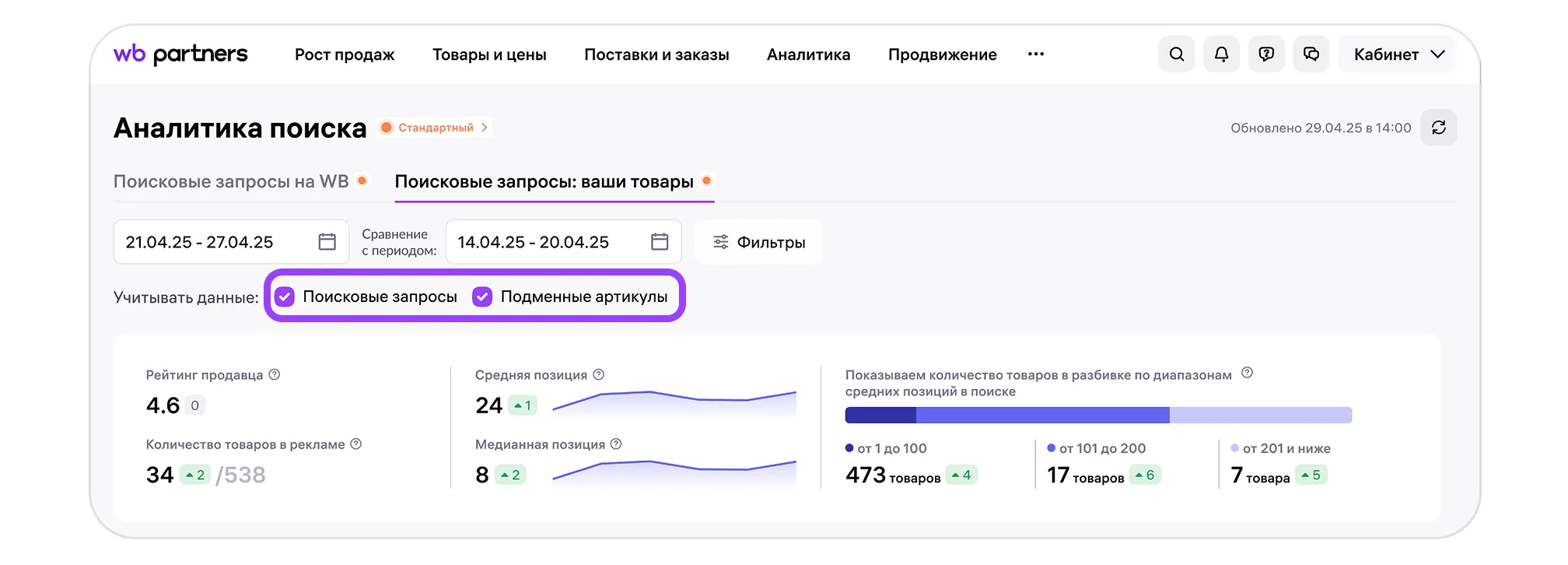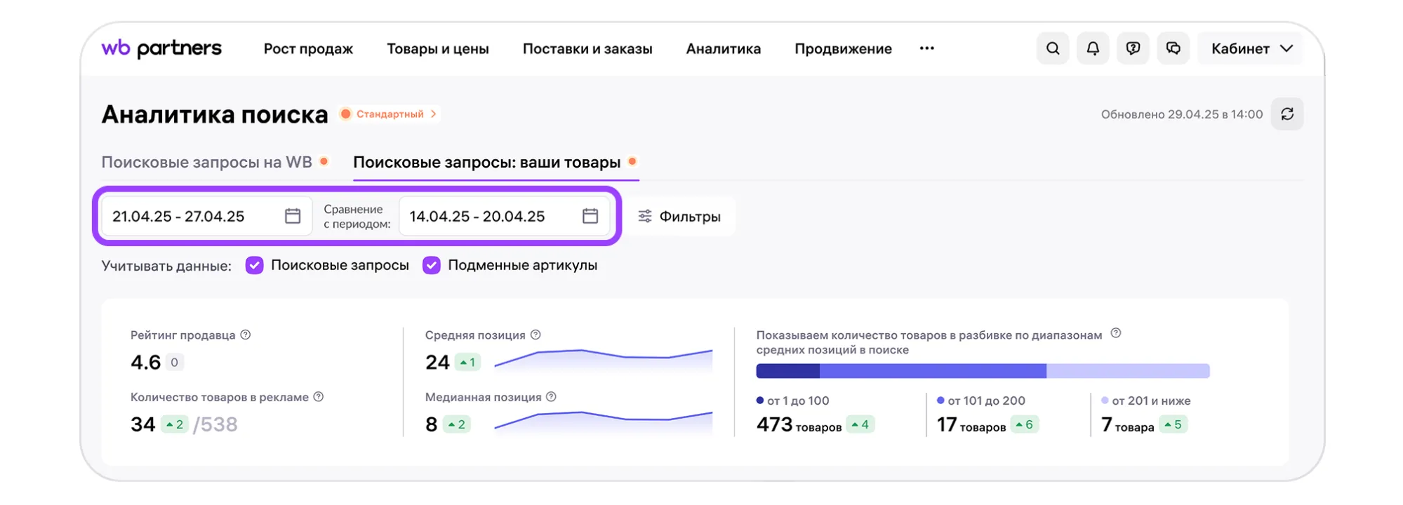 Средняя позиция в поиске — позиция товара в поисковой выдаче. Учтены только случаи, когда покупатели, найдя товар в поиске, перешли в карточку товара или сразу добавили его в корзину.
