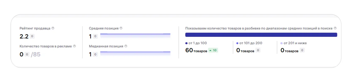В таблице собраны данные по вашим товарам и их месту в поисковой выдаче в соотношении с товарами других продавцов. Здесь же показаны запросы, по которым покупатели находят ваши товары в поиске, факторы, которые повлияли на позицию ваших карточек, и рекомендации по улучшению позиций.