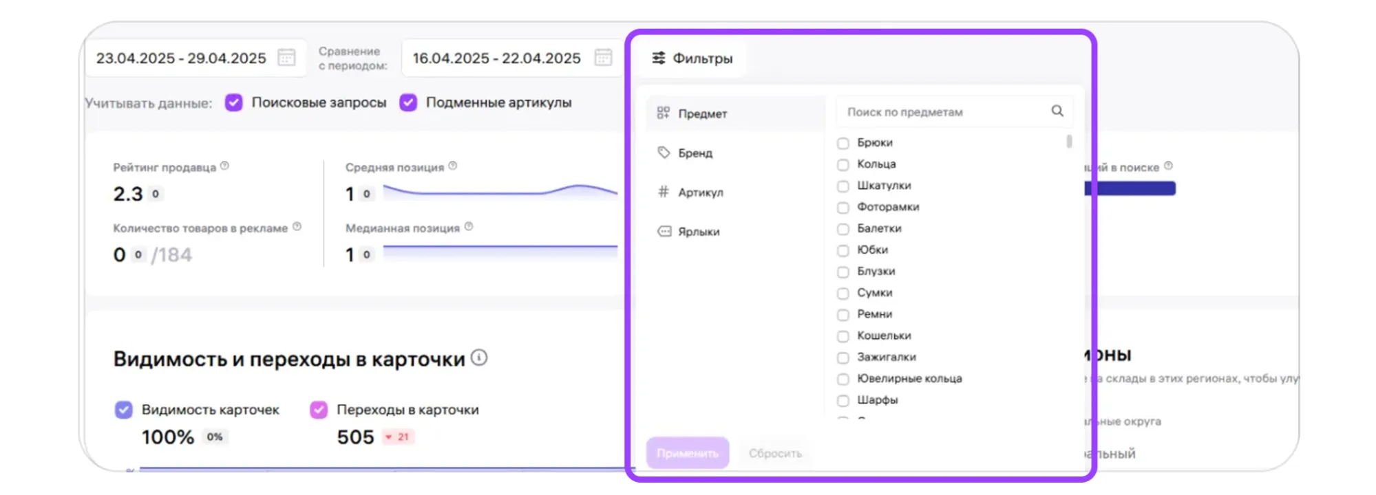 Для детального анализа используйте фильтры: по предметам, брендам, артикулам и ярлыкам. Вернуться к данным по умолчанию можно, нажав кнопку «Сбросить».