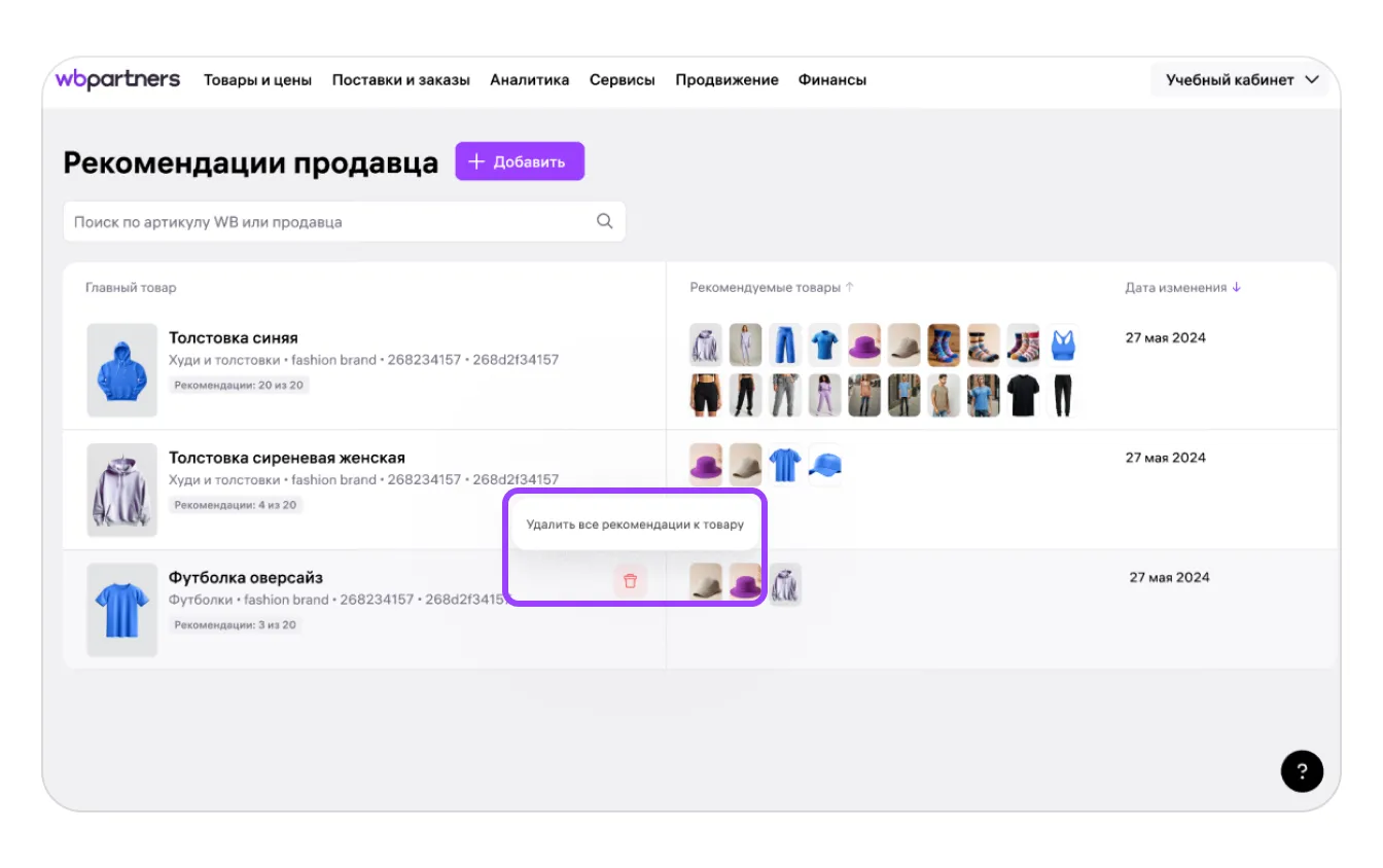 Чтобы удалить отдельную рекомендацию, наведите курсор на карточку товара в списке. Появится иконка корзины — нажмите на неё. Далее подтвердите действие во всплывающем окне.