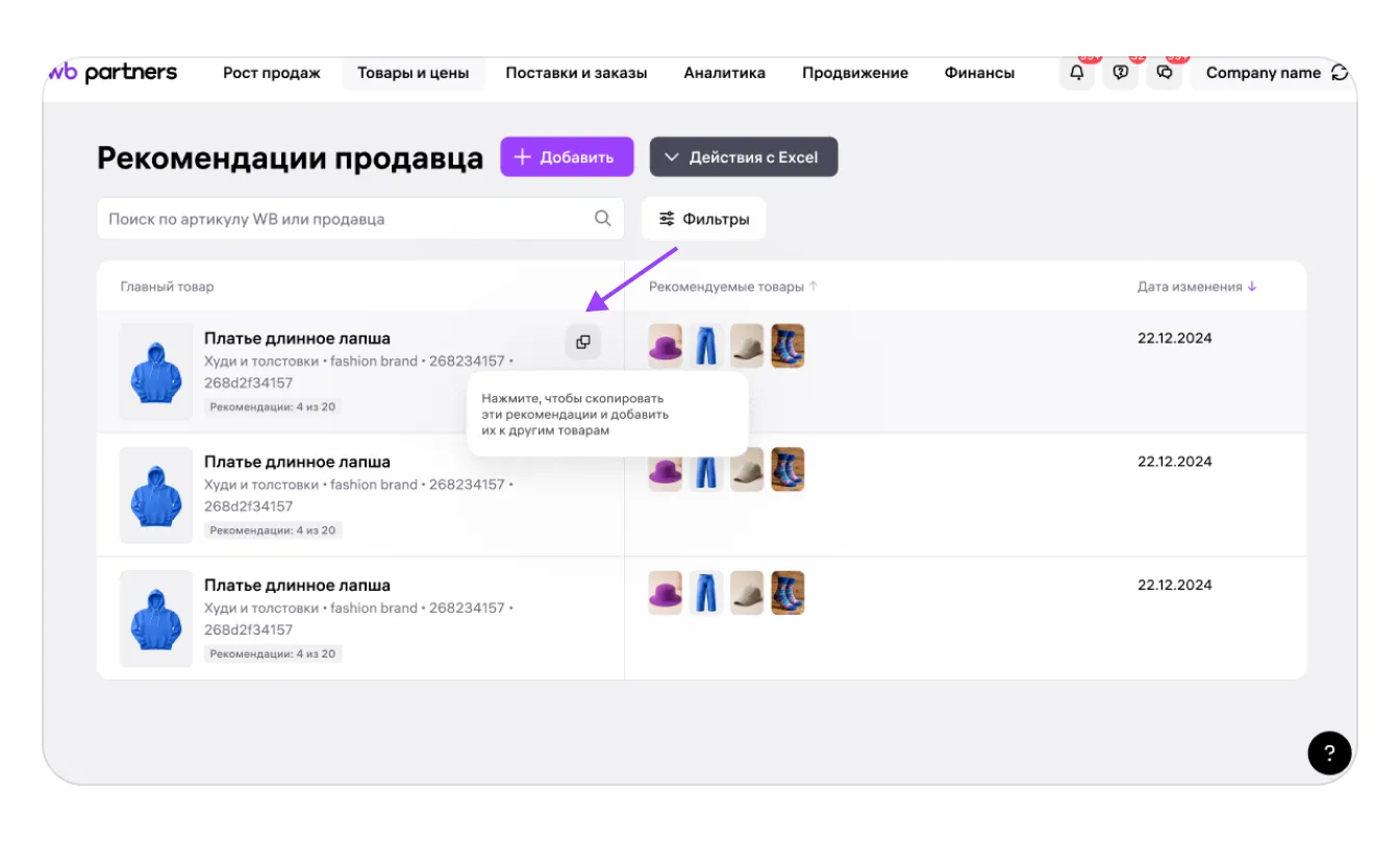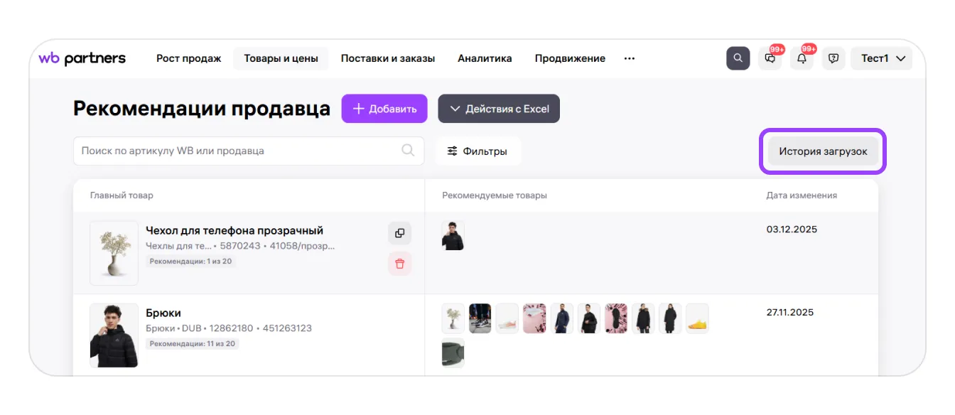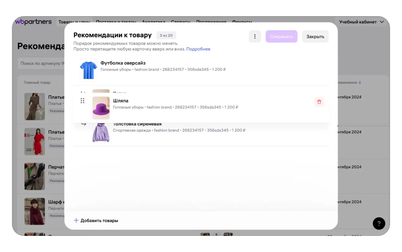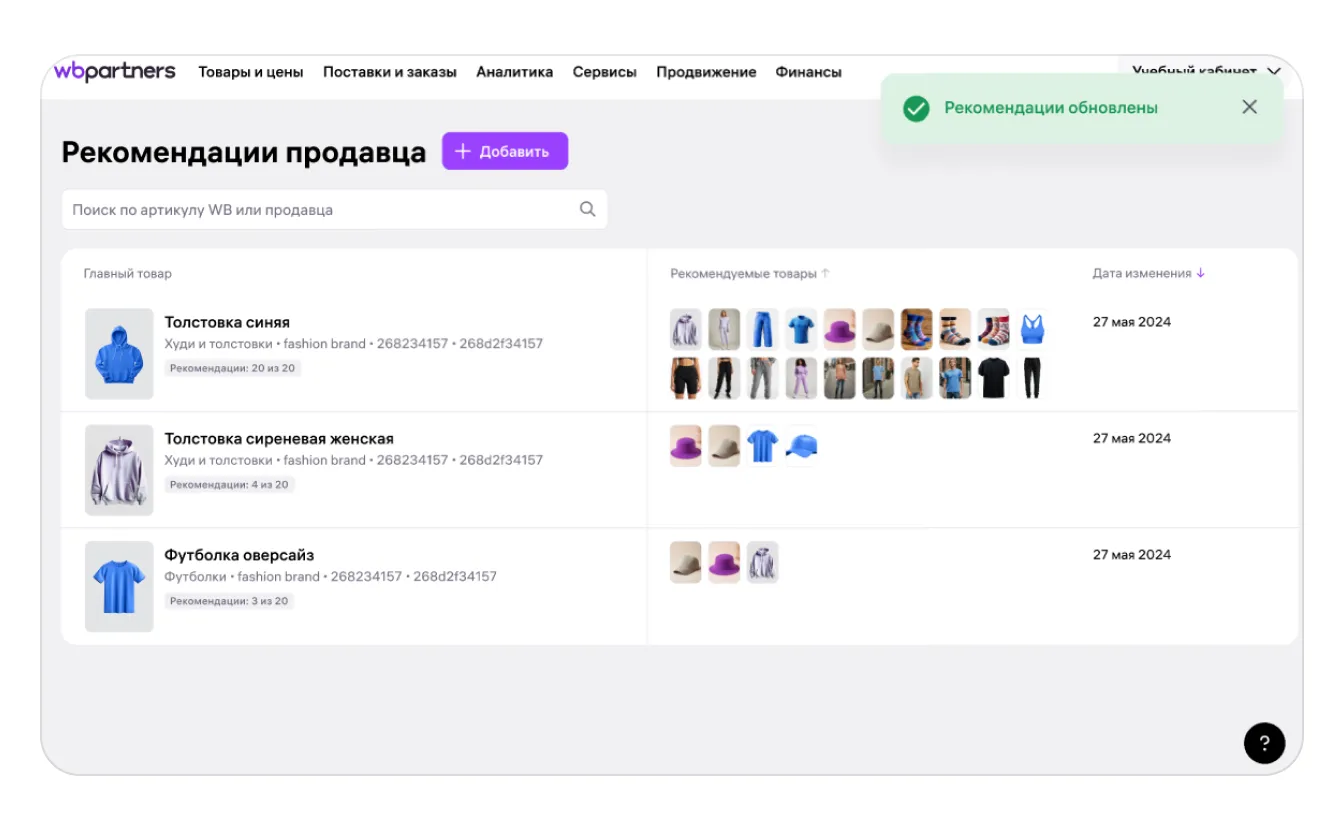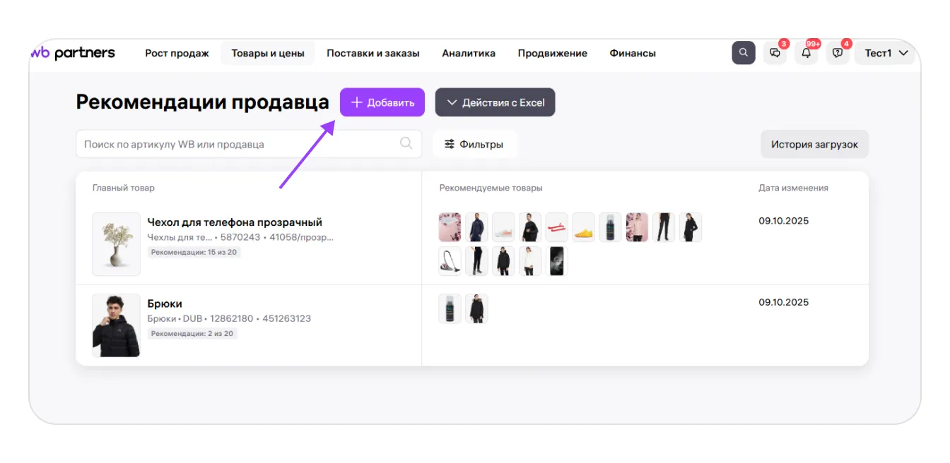 Активные рекомендации можно редактировать: добавлять новые, менять последовательность отображения товаров в блоке или удалять. Для этого перейдите: Товары и цены → Рекомендации. На странице будут показаны все карточки, у которых уже есть блок «Продавец рекомендует».