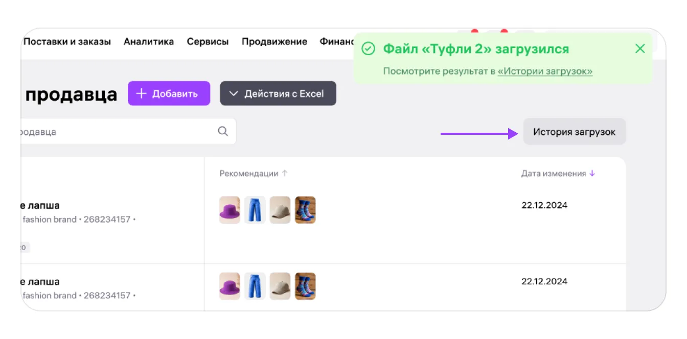 Все массовые изменения, в том числе удаление, попадают в историю загрузок. Чтобы её посмотреть, на главной странице рекомендаций кликните на эту кнопку. Откроется окно с данными: имя файла, дата и статус загрузки.
