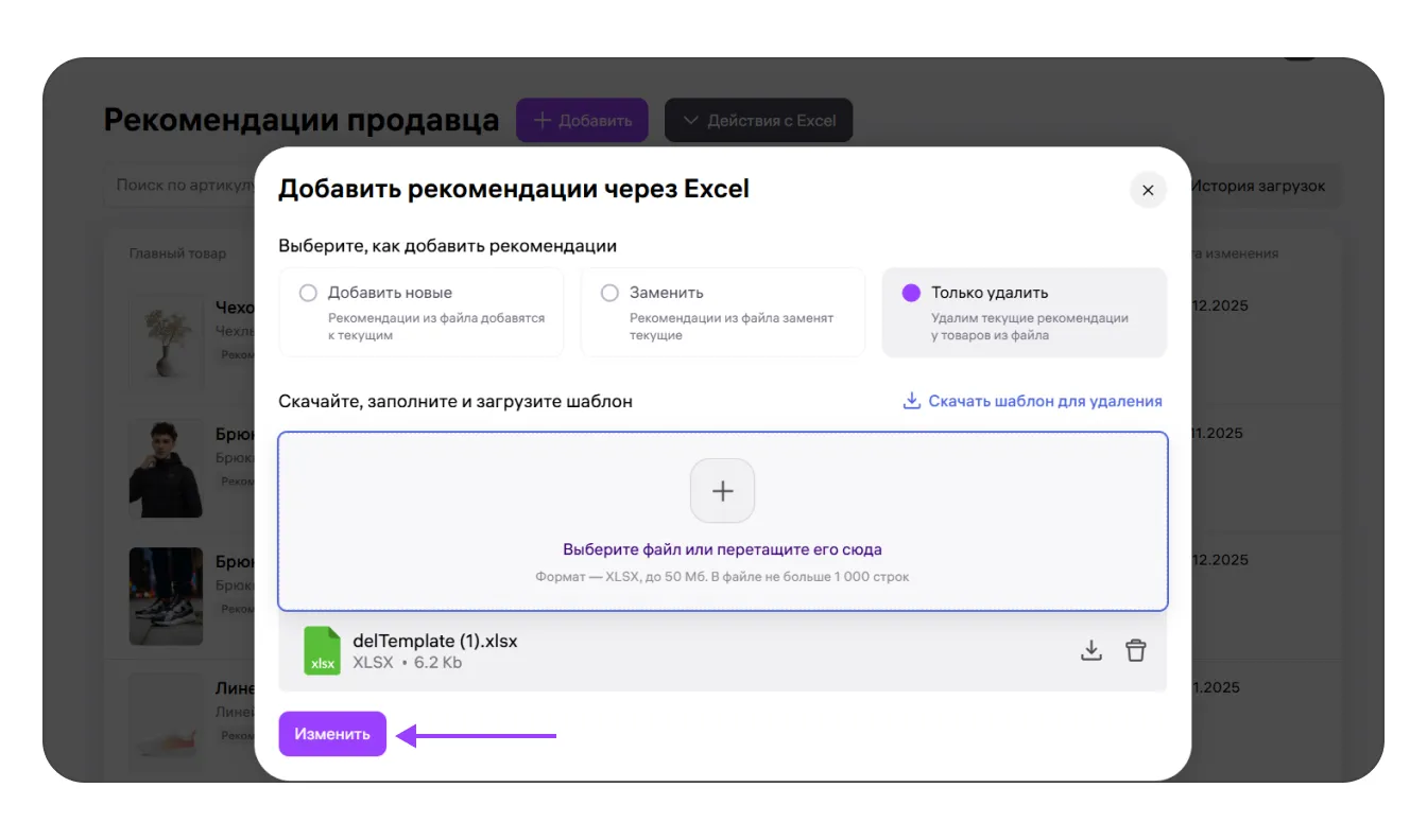 Если нужно удалить рекомендации сразу для многих карточек, используйте массовое удаление через XLSX-файл.