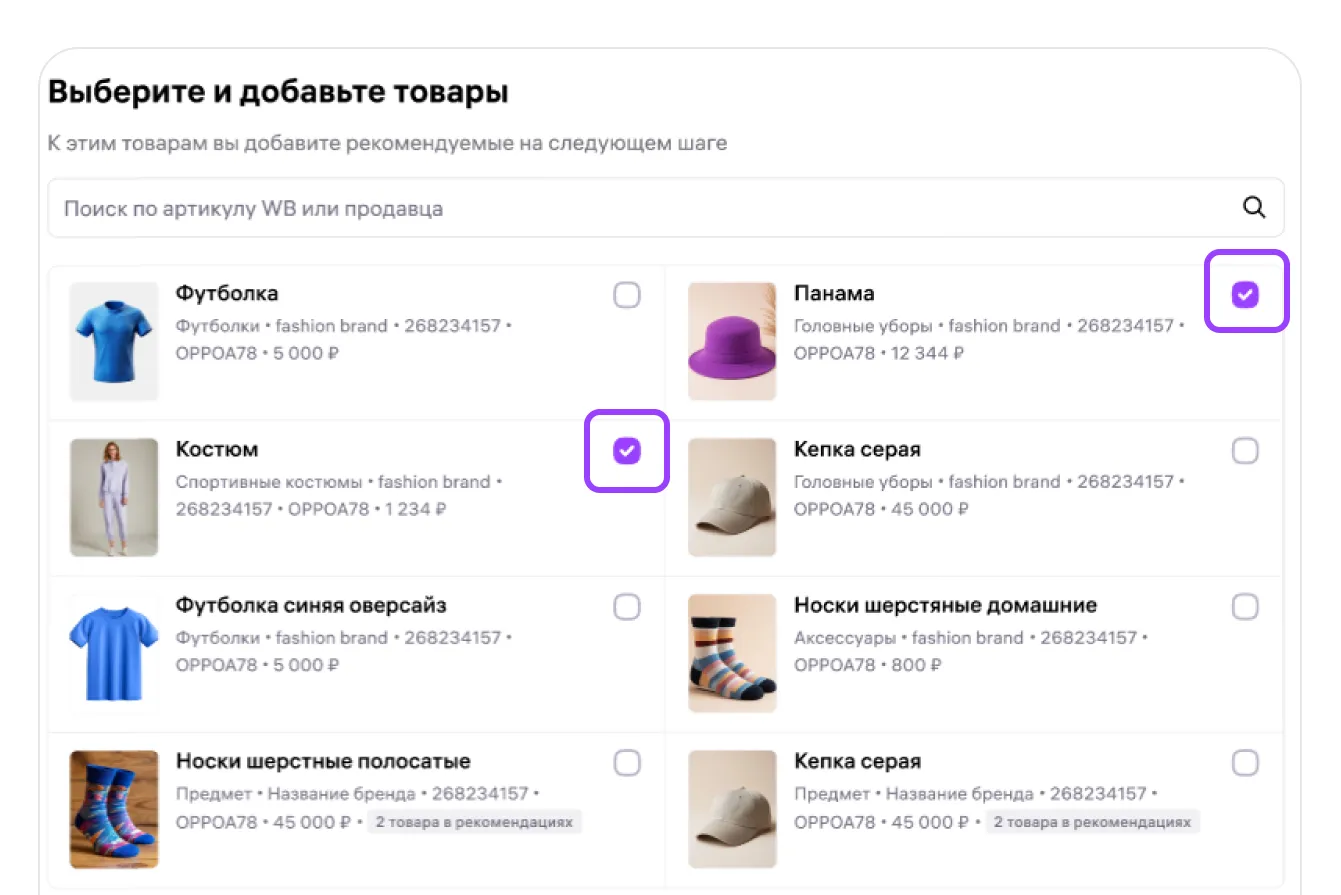 4. Вновь откроется список ваших карточек товара, но на этот раз нужно выбрать товары, которые хотите добавить как рекомендацию. В конце нажмите кнопку «Добавить товары». Допустим, вы выбрали футболку и носки — эти два товара появятся в блоке «Продавец рекомендует» у выбранных выше карточек: панамы и костюма.