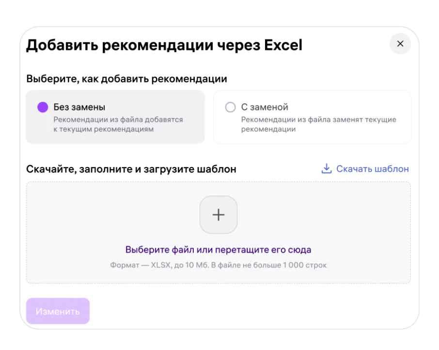 Вы можете загрузить Excel-файл с артикулами товаров и одним действием настроить рекомендации сразу для множества карточек товаров.
